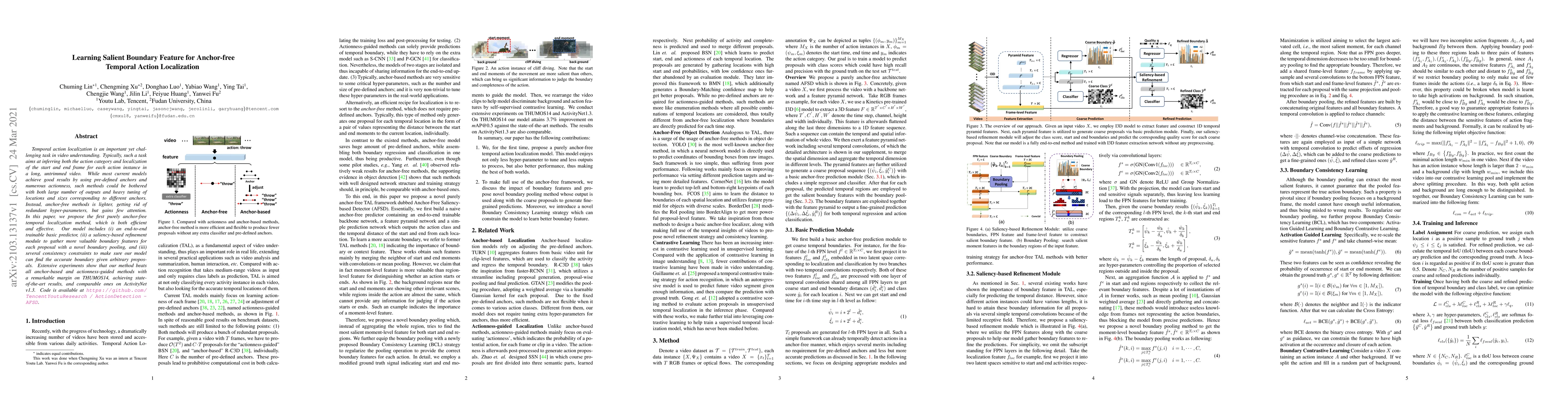 This paper proposes an efficient anchor-free method for temporal action localization, featuring an end-to-end predictor, a saliency-based refinement module, and consistency constraints. The method outperforms anchor-based approaches and achieves state-of-the-art results on THUMOS14.