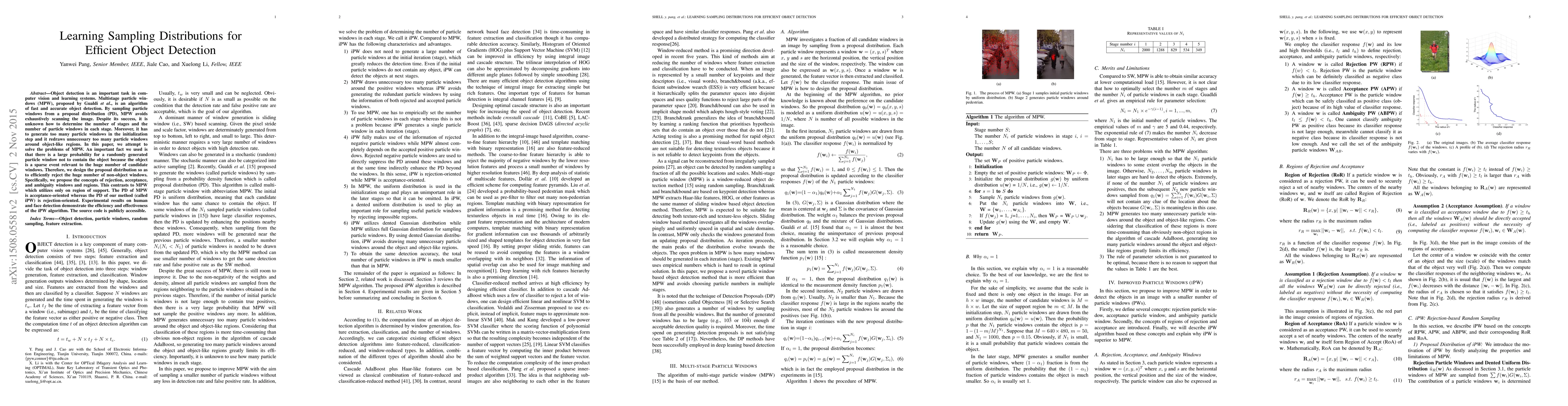 Object detection is an important task in computer vision and learning systems. Multistage particle windows (MPW), proposed by Gualdi et al., is an algorithm of fast and accurate object detection. By sampling particle windows from a proposal distribution (PD), MPW avoids exhaustively scanning the image. Despite its success, it is unknown how to determine the number of stages and the number of particle windows in each stage. Moreover, it has to generate too many particle windows in the initialization step and it redraws unnecessary too many particle windows around object-like regions. In this paper, we attempt to solve the problems of MPW. An important fact we used is that there is large probability for a randomly generated particle window not to contain the object because the object is a sparse event relevant to the huge number of candidate windows. Therefore, we design the proposal distribution so as to efficiently reject the huge number of non-object windows. Specifically, we propose the concepts of rejection, acceptance, and ambiguity windows and regions. This contrasts to MPW which utilizes only on region of support. The PD of MPW is acceptance-oriented whereas the PD of our method (called iPW) is rejection-oriented. Experimental results on human and face detection demonstrate the efficiency and effectiveness of the iPW algorithm. The source code is publicly accessible.
