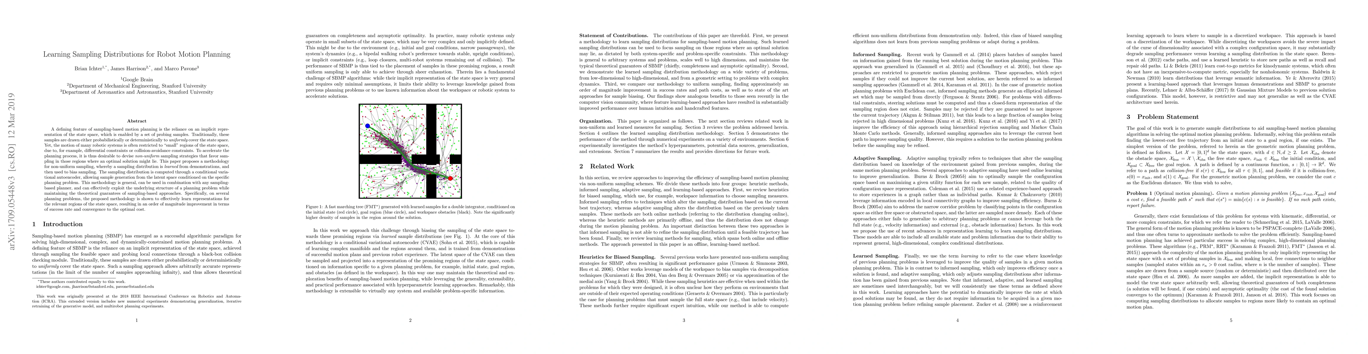 This paper proposes a methodology for non-uniform sampling in robot motion planning using a learned sampling distribution from demonstrations. It employs a conditional variational autoencoder to generate samples biased towards optimal regions, improving success rates and convergence to optimal solutions by an order of magnitude.