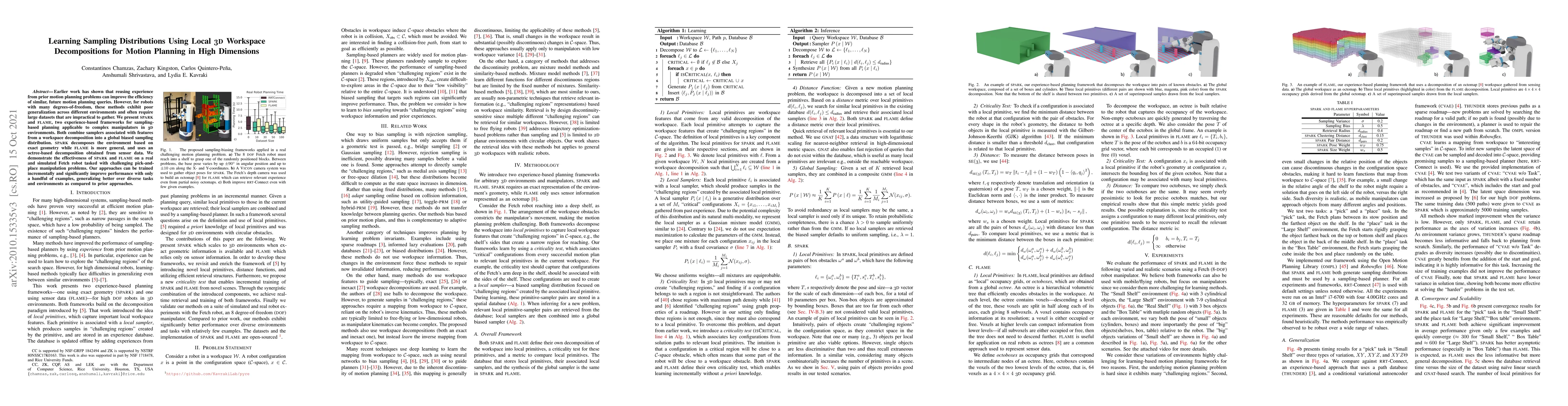 This paper introduces SPARK and FLAME, two frameworks for experience-based sampling in high-dimensional motion planning, which utilize local 3D workspace decompositions to improve generalization and efficiency. Both methods show significant performance improvements with minimal training examples compared to prior approaches.