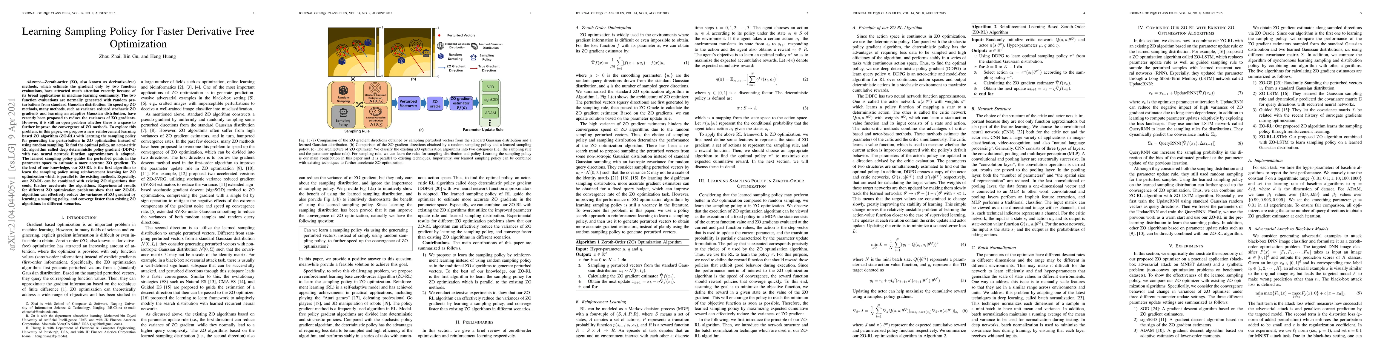 This paper proposes a reinforcement learning-based zeroth-order optimization algorithm (ZO-RL) that learns a sampling policy to generate perturbations, aiming to reduce the variance of zeroth-order gradients and accelerate convergence. The deep deterministic policy gradient (DDPG) method is used to find the optimal policy, which guides perturbed points more accurately, resulting in faster convergence compared to existing random sampling methods.