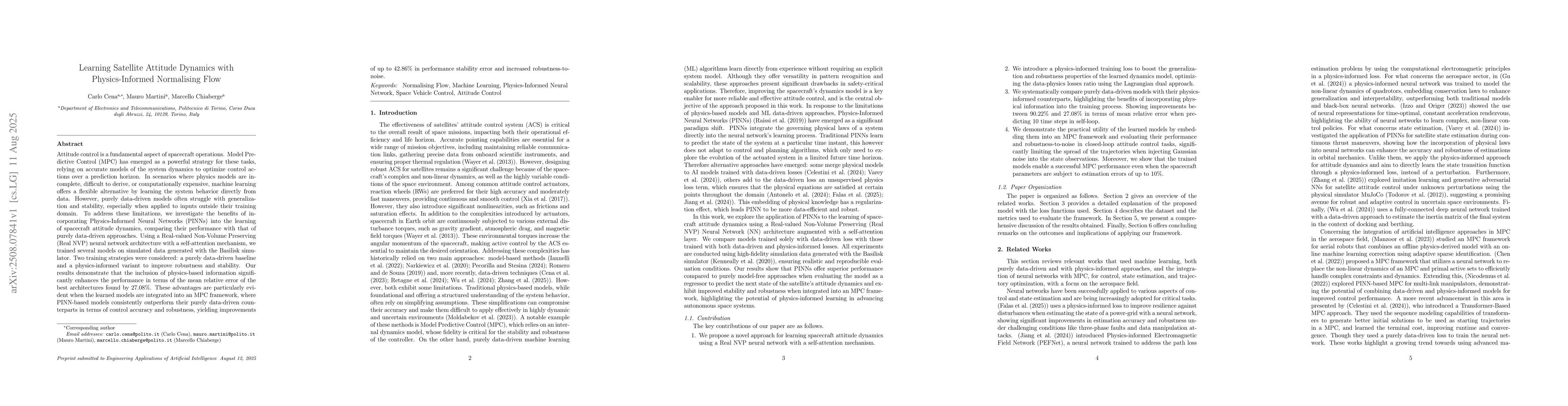 Attitude control is a fundamental aspect of spacecraft operations. Model Predictive Control (MPC) has emerged as a powerful strategy for these tasks, relying on accurate models of the system dynamics to optimize control actions over a prediction horizon. In scenarios where physics models are incomplete, difficult to derive, or computationally expensive, machine learning offers a flexible alternative by learning the system behavior directly from data. However, purely data-driven models often struggle with generalization and stability, especially when applied to inputs outside their training domain. To address these limitations, we investigate the benefits of incorporating Physics-Informed Neural Networks (PINNs) into the learning of spacecraft attitude dynamics, comparing their performance with that of purely data-driven approaches. Using a Real-valued Non-Volume Preserving (Real NVP) neural network architecture with a self-attention mechanism, we trained several models on simulated data generated with the Basilisk simulator. Two training strategies were considered: a purely data-driven baseline and a physics-informed variant to improve robustness and stability. Our results demonstrate that the inclusion of physics-based information significantly enhances the performance in terms of the mean relative error of the best architectures found by 27.08%. These advantages are particularly evident when the learned models are integrated into an MPC framework, where PINN-based models consistently outperform their purely data-driven counterparts in terms of control accuracy and robustness, yielding improvements of up to 42.86% in performance stability error and increased robustness-to-noise.