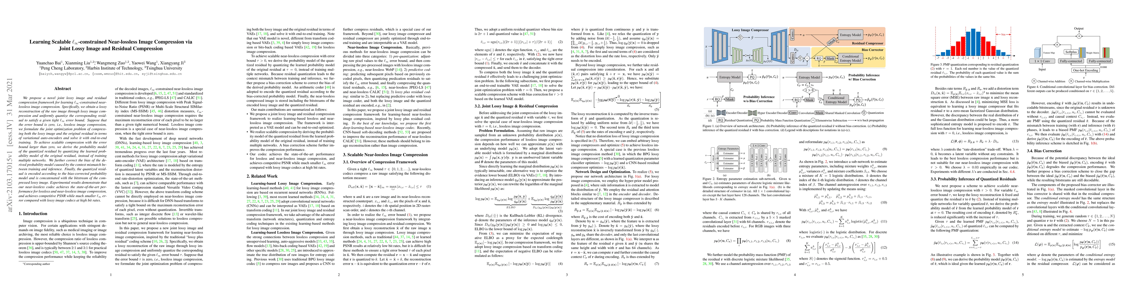 We propose a novel joint lossy image and residual compression framework for learning $\ell_\infty$-constrained near-lossless image compression. Specifically, we obtain a lossy reconstruction of the raw image through lossy image compression and uniformly quantize the corresponding residual to satisfy a given tight $\ell_\infty$ error bound. Suppose that the error bound is zero, i.e., lossless image compression, we formulate the joint optimization problem of compressing both the lossy image and the original residual in terms of variational auto-encoders and solve it with end-to-end training. To achieve scalable compression with the error bound larger than zero, we derive the probability model of the quantized residual by quantizing the learned probability model of the original residual, instead of training multiple networks. We further correct the bias of the derived probability model caused by the context mismatch between training and inference. Finally, the quantized residual is encoded according to the bias-corrected probability model and is concatenated with the bitstream of the compressed lossy image. Experimental results demonstrate that our near-lossless codec achieves the state-of-the-art performance for lossless and near-lossless image compression, and achieves competitive PSNR while much smaller $\ell_\infty$ error compared with lossy image codecs at high bit rates.