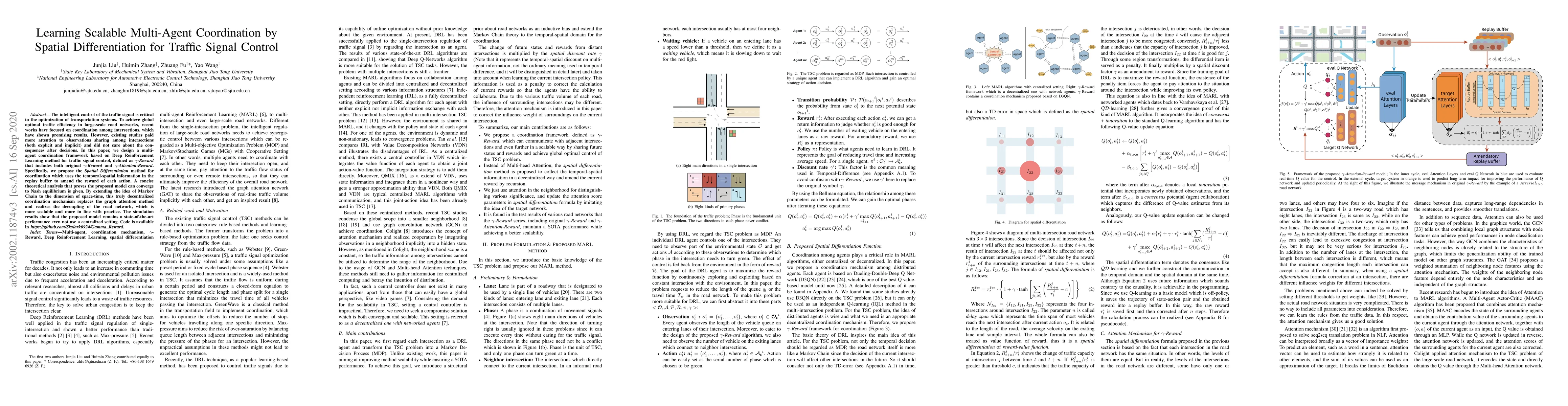 This paper proposes a scalable multi-agent coordination framework using Deep Reinforcement Learning for traffic signal control, introducing a Spatial Differentiation method that enhances rewards based on temporal-spatial information. The model achieves state-of-the-art performance in decentralized settings, demonstrating scalability and practical applicability.