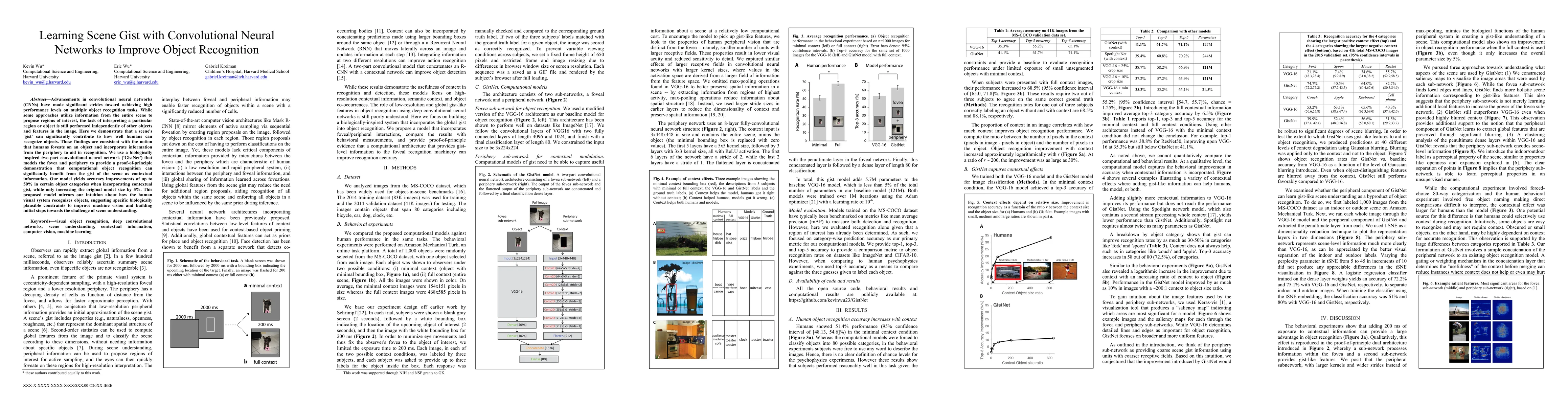 Advancements in convolutional neural networks (CNNs) have made significant strides toward achieving high performance levels on multiple object recognition tasks. While some approaches utilize information from the entire scene to propose regions of interest, the task of interpreting a particular region or object is still performed independently of other objects and features in the image. Here we demonstrate that a scene's 'gist' can significantly contribute to how well humans can recognize objects. These findings are consistent with the notion that humans foveate on an object and incorporate information from the periphery to aid in recognition. We use a biologically inspired two-part convolutional neural network ('GistNet') that models the fovea and periphery to provide a proof-of-principle demonstration that computational object recognition can significantly benefit from the gist of the scene as contextual information. Our model yields accuracy improvements of up to 50% in certain object categories when incorporating contextual gist, while only increasing the original model size by 5%. This proposed model mirrors our intuition about how the human visual system recognizes objects, suggesting specific biologically plausible constraints to improve machine vision and building initial steps towards the challenge of scene understanding.