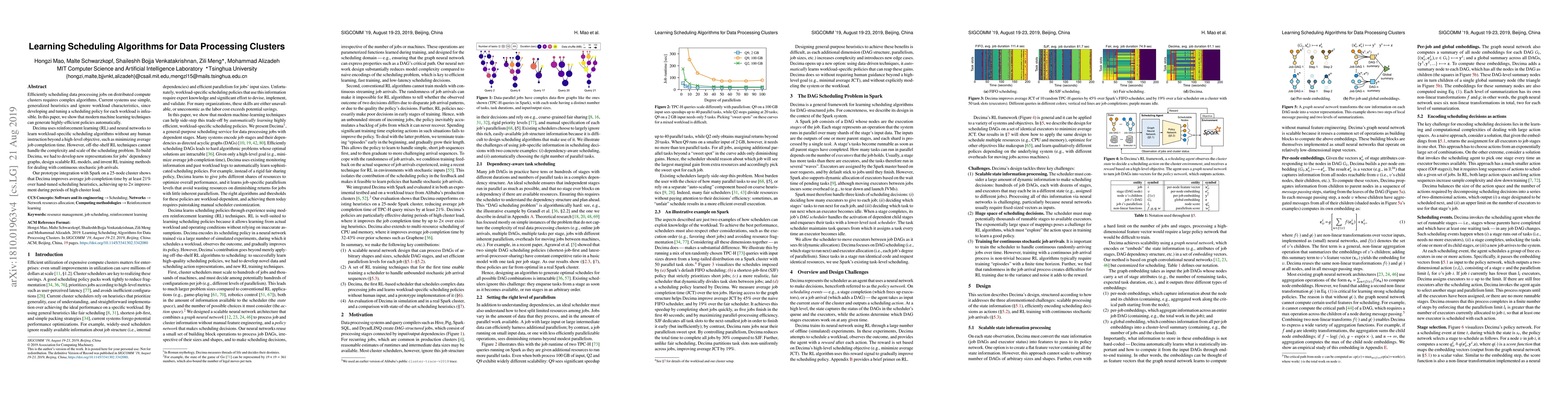 This paper presents Decima, a machine learning-based scheduling algorithm that uses reinforcement learning and neural networks to automatically generate highly-efficient, workload-specific scheduling policies for data processing clusters. Decima improves average job completion time by at least 21% over traditional heuristics, especially during high cluster load.