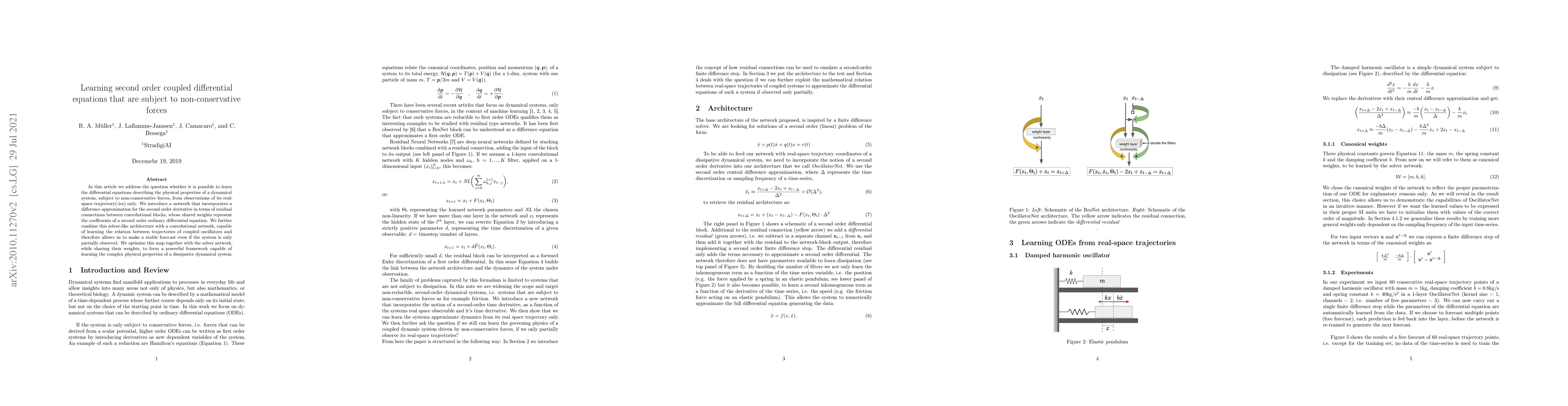 In this article we address the question whether it is possible to learn the differential equations describing the physical properties of a dynamical system, subject to non-conservative forces, from observations of its realspace trajectory(ies) only. We introduce a network that incorporates a difference approximation for the second order derivative in terms of residual connections between convolutional blocks, whose shared weights represent the coefficients of a second order ordinary differential equation. We further combine this solver-like architecture with a convolutional network, capable of learning the relation between trajectories of coupled oscillators and therefore allows us to make a stable forecast even if the system is only partially observed. We optimize this map together with the solver network, while sharing their weights, to form a powerful framework capable of learning the complex physical properties of a dissipative dynamical system.
