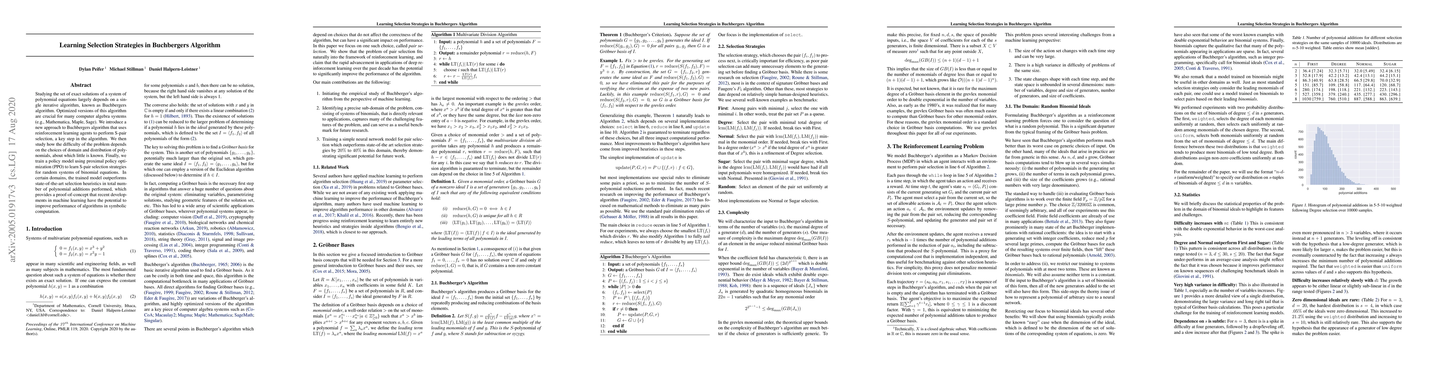 Studying the set of exact solutions of a system of polynomial equations largely depends on a single iterative algorithm, known as Buchberger's algorithm. Optimized versions of this algorithm are crucial for many computer algebra systems (e.g., Mathematica, Maple, Sage). We introduce a new approach to Buchberger's algorithm that uses reinforcement learning agents to perform S-pair selection, a key step in the algorithm. We then study how the difficulty of the problem depends on the choices of domain and distribution of polynomials, about which little is known. Finally, we train a policy model using proximal policy optimization (PPO) to learn S-pair selection strategies for random systems of binomial equations. In certain domains, the trained model outperforms state-of-the-art selection heuristics in total number of polynomial additions performed, which provides a proof-of-concept that recent developments in machine learning have the potential to improve performance of algorithms in symbolic computation.