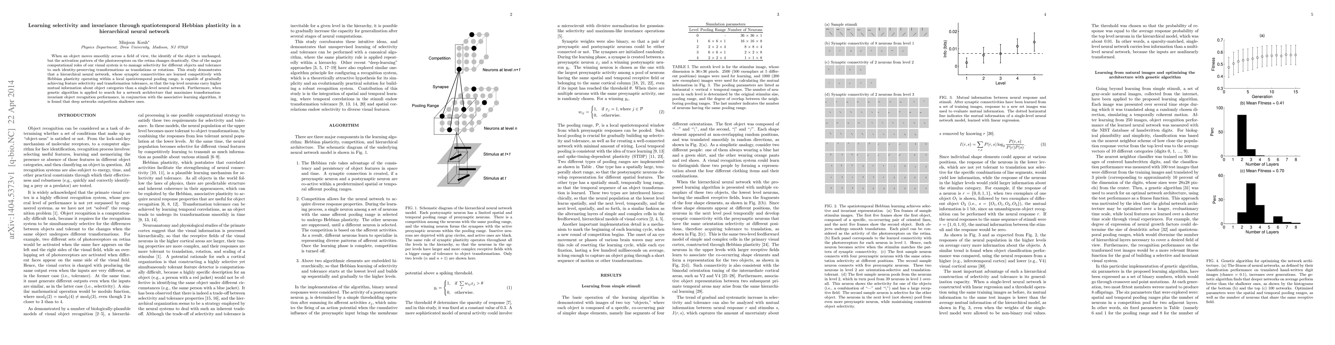 This research shows that a hierarchical neural network, using spatiotemporal Hebbian plasticity, can learn to recognize objects despite changes in retinal activation patterns due to movement. Deep networks, optimized by a genetic algorithm for transformation-invariant recognition, outperform shallower ones, highlighting the visual system's role in object selectivity and tolerance to identity-preserving transformations.