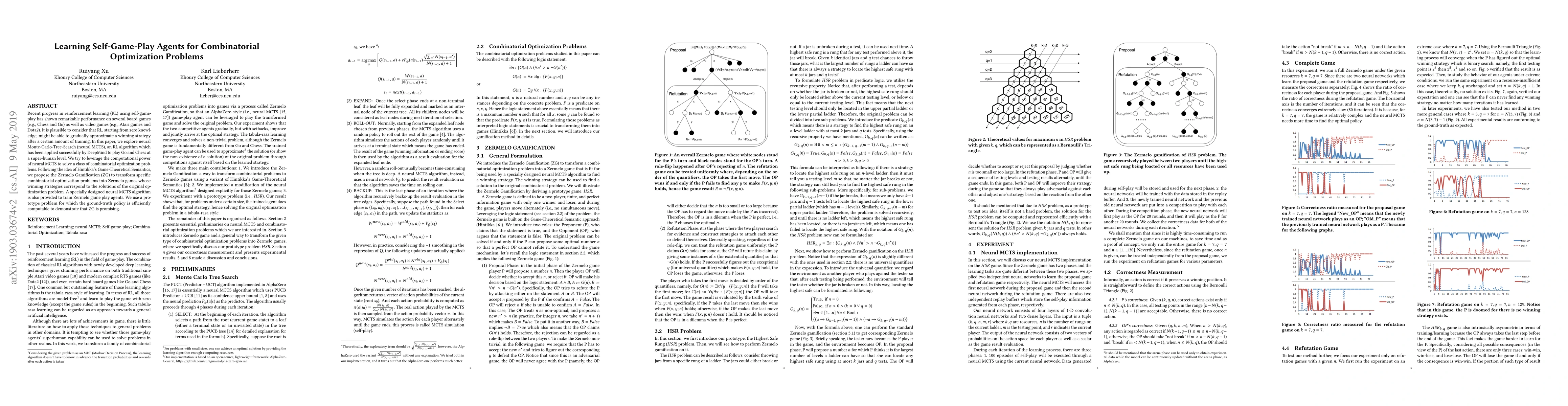 This paper explores using neural Monte-Carlo-Tree-Search (neural MCTS) to solve combinatorial optimization problems by transforming them into Zermelo games, leveraging RL's self-game-play approach. The Zermelo Gamification (ZG) method shows promise in finding optimal solutions for combinatorial planning problems.