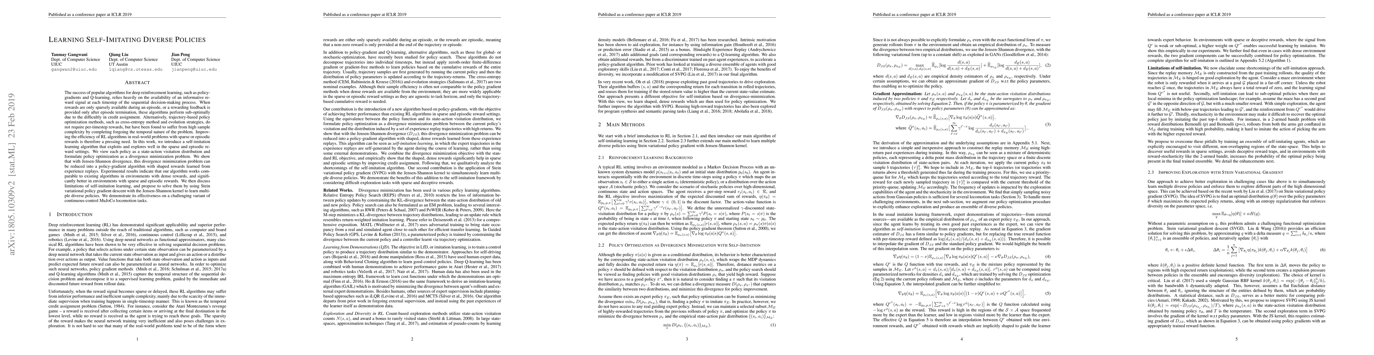 The success of popular algorithms for deep reinforcement learning, such as policy-gradients and Q-learning, relies heavily on the availability of an informative reward signal at each timestep of the sequential decision-making process. When rewards are only sparsely available during an episode, or a rewarding feedback is provided only after episode termination, these algorithms perform sub-optimally due to the difficultly in credit assignment. Alternatively, trajectory-based policy optimization methods, such as cross-entropy method and evolution strategies, do not require per-timestep rewards, but have been found to suffer from high sample complexity by completing forgoing the temporal nature of the problem. Improving the efficiency of RL algorithms in real-world problems with sparse or episodic rewards is therefore a pressing need. In this work, we introduce a self-imitation learning algorithm that exploits and explores well in the sparse and episodic reward settings. We view each policy as a state-action visitation distribution and formulate policy optimization as a divergence minimization problem. We show that with Jensen-Shannon divergence, this divergence minimization problem can be reduced into a policy-gradient algorithm with shaped rewards learned from experience replays. Experimental results indicate that our algorithm works comparable to existing algorithms in environments with dense rewards, and significantly better in environments with sparse and episodic rewards. We then discuss limitations of self-imitation learning, and propose to solve them by using Stein variational policy gradient descent with the Jensen-Shannon kernel to learn multiple diverse policies. We demonstrate its effectiveness on a challenging variant of continuous-control MuJoCo locomotion tasks.