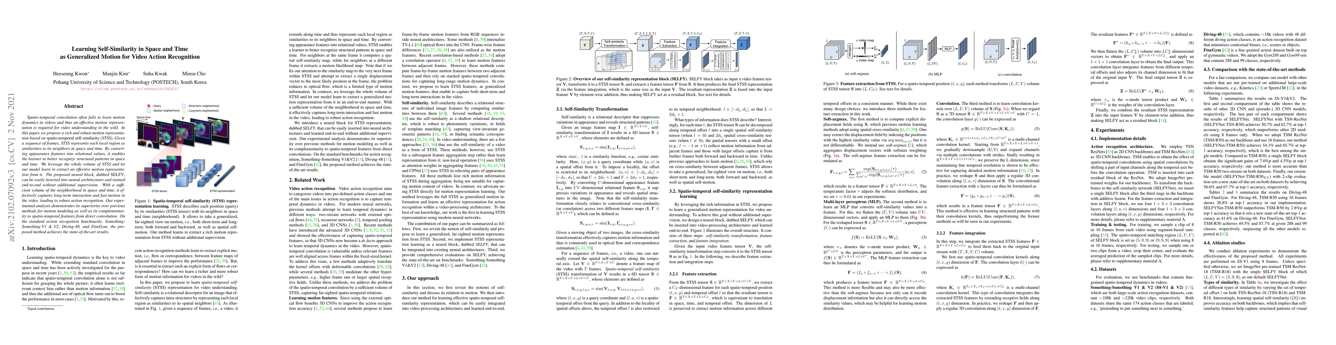 Spatio-temporal convolution often fails to learn motion dynamics in videos and thus an effective motion representation is required for video understanding in the wild. In this paper, we propose a rich and robust motion representation based on spatio-temporal self-similarity (STSS). Given a sequence of frames, STSS represents each local region as similarities to its neighbors in space and time. By converting appearance features into relational values, it enables the learner to better recognize structural patterns in space and time. We leverage the whole volume of STSS and let our model learn to extract an effective motion representation from it. The proposed neural block, dubbed SELFY, can be easily inserted into neural architectures and trained end-to-end without additional supervision. With a sufficient volume of the neighborhood in space and time, it effectively captures long-term interaction and fast motion in the video, leading to robust action recognition. Our experimental analysis demonstrates its superiority over previous methods for motion modeling as well as its complementarity to spatio-temporal features from direct convolution. On the standard action recognition benchmarks, Something-Something-V1 & V2, Diving-48, and FineGym, the proposed method achieves the state-of-the-art results.