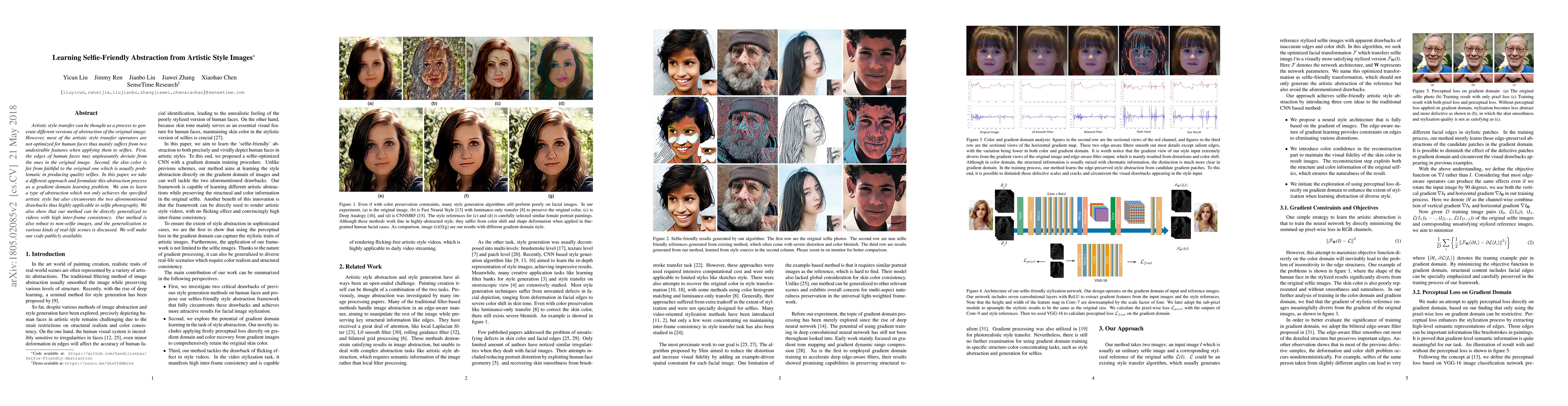 This paper proposes a gradient domain learning approach to generate artistic style abstractions that are optimized for selfies, addressing issues of face edge distortion and skin color fidelity. The method is shown to generalize well to videos and various real-life scenes, with plans to release the code publicly.
