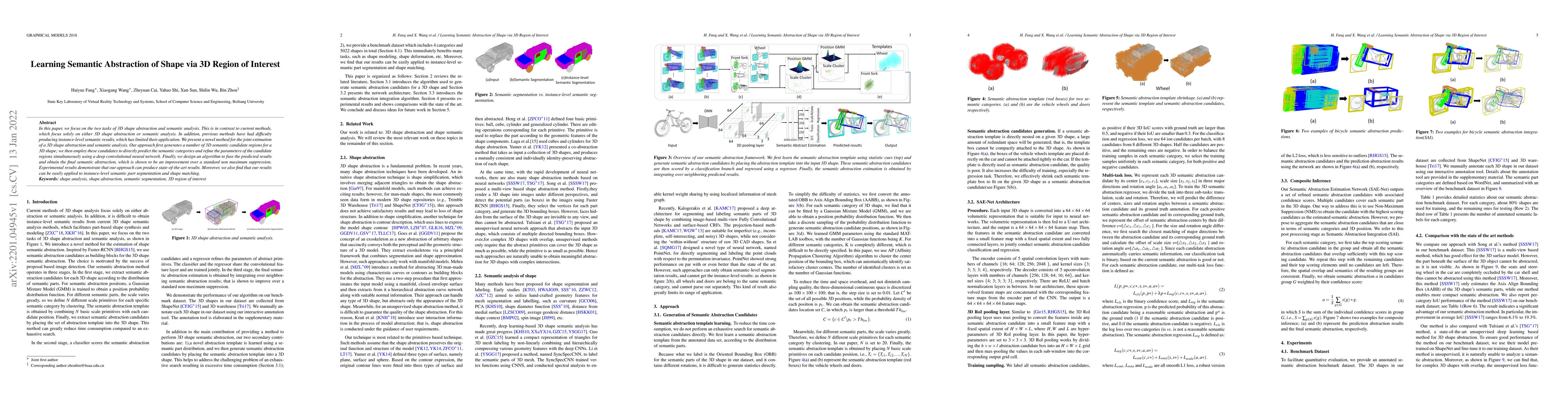 In this paper, we focus on the two tasks of 3D shape abstraction and semantic analysis. This is in contrast to current methods, which focus solely on either 3D shape abstraction or semantic analysis. In addition, previous methods have had difficulty producing instance-level semantic results, which has limited their application. We present a novel method for the joint estimation of a 3D shape abstraction and semantic analysis. Our approach first generates a number of 3D semantic candidate regions for a 3D shape; we then employ these candidates to directly predict the semantic categories and refine the parameters of the candidate regions simultaneously using a deep convolutional neural network. Finally, we design an algorithm to fuse the predicted results and obtain the final semantic abstraction, which is shown to be an improvement over a standard non maximum suppression. Experimental results demonstrate that our approach can produce state-of-the-art results. Moreover, we also find that our results can be easily applied to instance-level semantic part segmentation and shape matching.