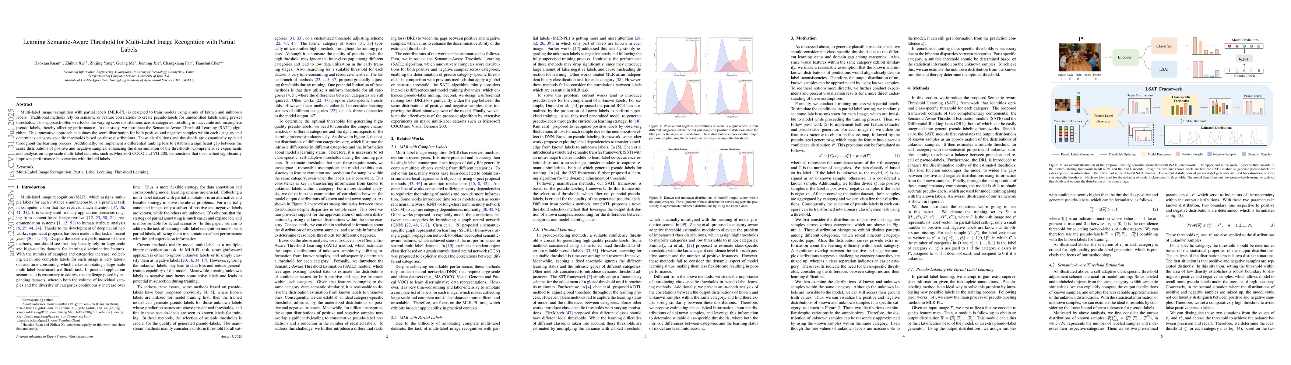 Multi-label image recognition with partial labels (MLR-PL) is designed to train models using a mix of known and unknown labels. Traditional methods rely on semantic or feature correlations to create pseudo-labels for unidentified labels using pre-set thresholds. This approach often overlooks the varying score distributions across categories, resulting in inaccurate and incomplete pseudo-labels, thereby affecting performance. In our study, we introduce the Semantic-Aware Threshold Learning (SATL) algorithm. This innovative approach calculates the score distribution for both positive and negative samples within each category and determines category-specific thresholds based on these distributions. These distributions and thresholds are dynamically updated throughout the learning process. Additionally, we implement a differential ranking loss to establish a significant gap between the score distributions of positive and negative samples, enhancing the discrimination of the thresholds. Comprehensive experiments and analysis on large-scale multi-label datasets, such as Microsoft COCO and VG-200, demonstrate that our method significantly improves performance in scenarios with limited labels.