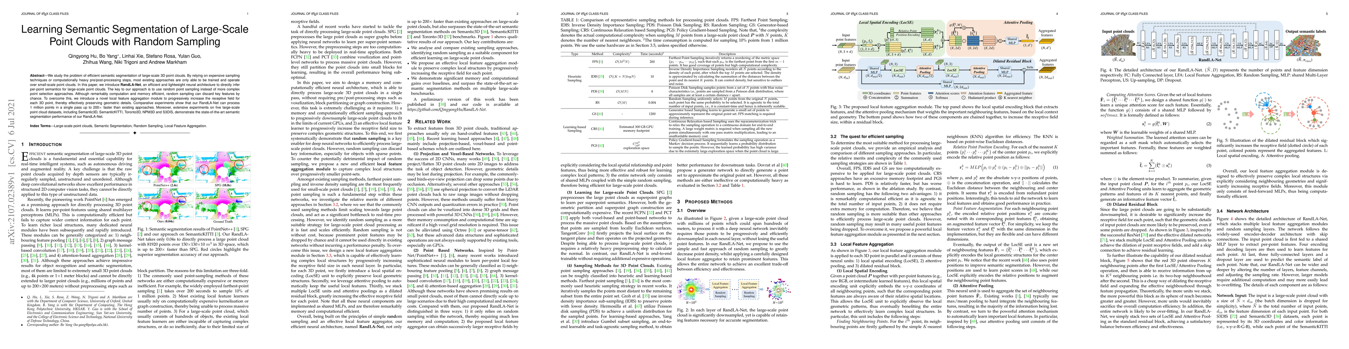 RandLA-Net introduces an efficient neural architecture for semantic segmentation of large-scale 3D point clouds using random sampling, paired with a local feature aggregation module for detail preservation, achieving up to 200x faster processing and state-of-the-art performance on multiple datasets.