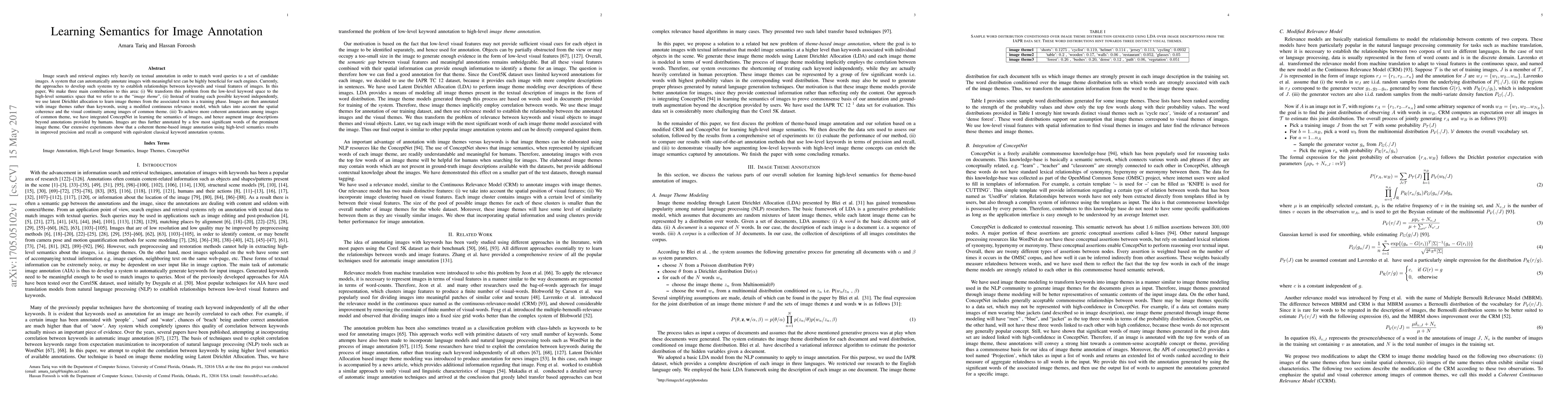 A new approach to image annotation improves precision and recall by using high-level semantics instead of keywords, resulting in coherent theme-based annotations that augment human descriptions with ConceptNet knowledge.