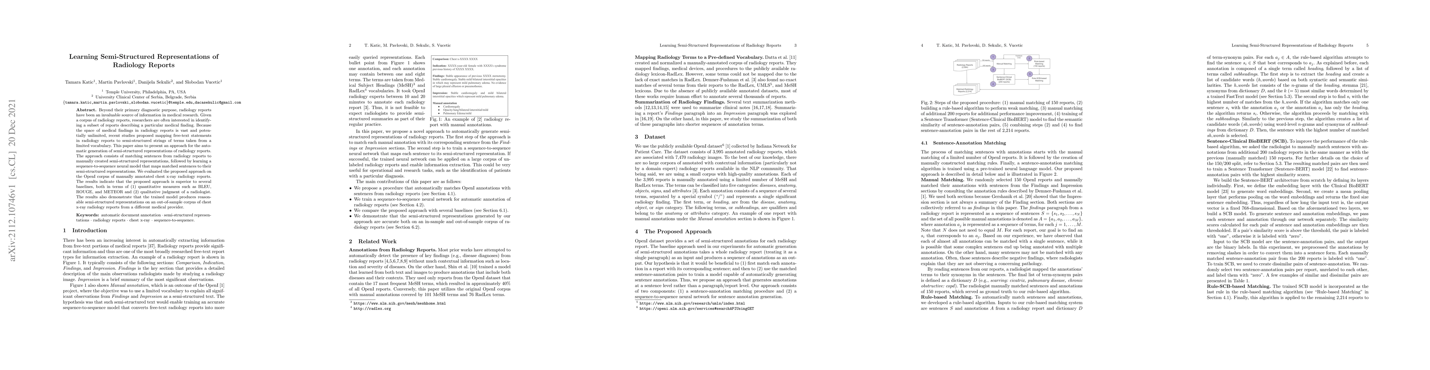 Beyond their primary diagnostic purpose, radiology reports have been an invaluable source of information in medical research. Given a corpus of radiology reports, researchers are often interested in identifying a subset of reports describing a particular medical finding. Because the space of medical findings in radiology reports is vast and potentially unlimited, recent studies proposed mapping free-text statements in radiology reports to semi-structured strings of terms taken from a limited vocabulary. This paper aims to present an approach for the automatic generation of semi-structured representations of radiology reports. The approach consists of matching sentences from radiology reports to manually created semi-structured representations, followed by learning a sequence-to-sequence neural model that maps matched sentences to their semi-structured representations. We evaluated the proposed approach on the OpenI corpus of manually annotated chest x-ray radiology reports. The results indicate that the proposed approach is superior to several baselines, both in terms of (1) quantitative measures such as BLEU, ROUGE, and METEOR and (2) qualitative judgment of a radiologist. The results also demonstrate that the trained model produces reasonable semi-structured representations on an out-of-sample corpus of chest x-ray radiology reports from a different medical provider.