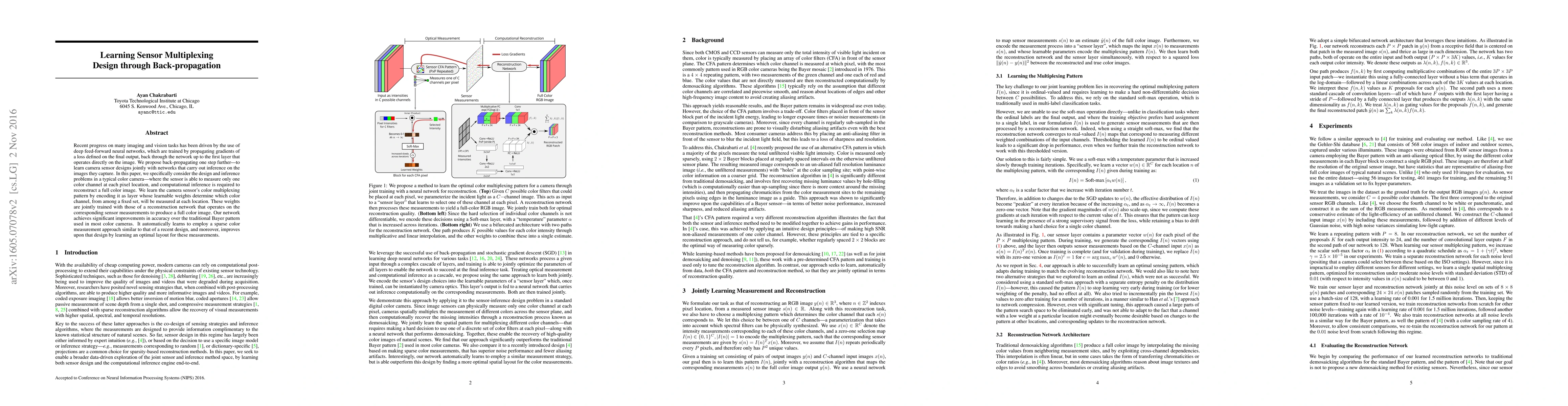 A new approach to camera sensor design uses back-propagation to learn an optimal color multiplexing pattern that improves image reconstruction accuracy. It achieves better results than traditional Bayer patterns used in most cameras.