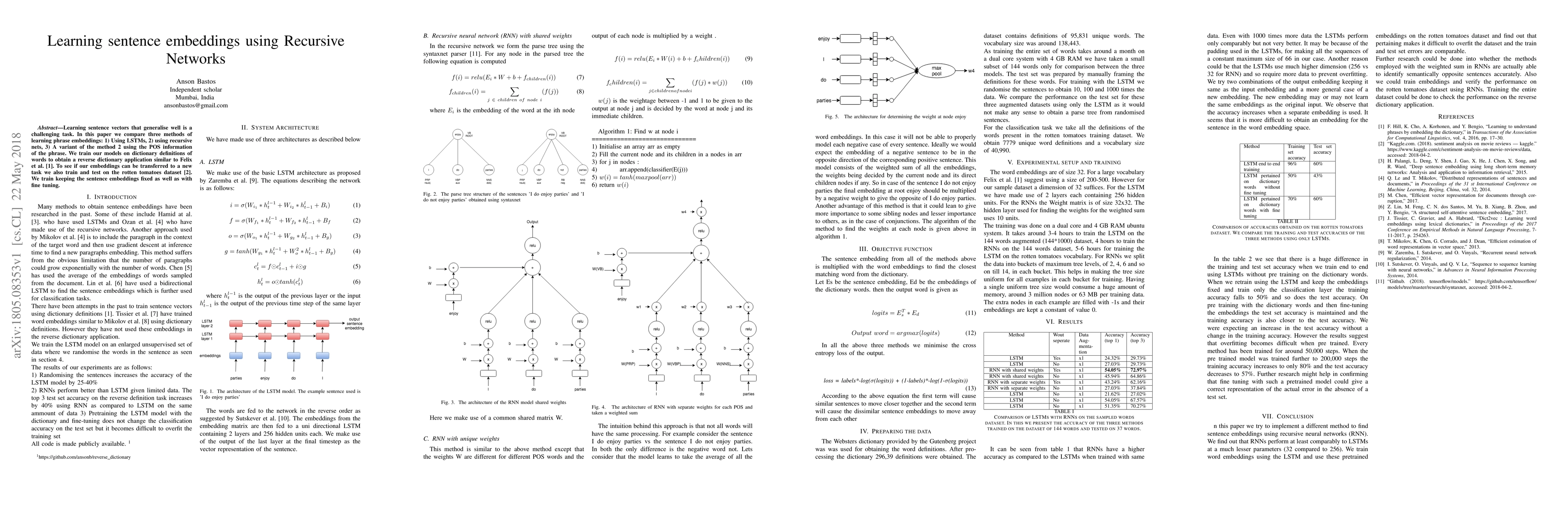 This paper compares three methods for learning sentence embeddings: LSTMs, recursive networks, and a POS-informed variant of recursive networks. The models are trained on dictionary definitions and tested for transferability on a Rotten Tomatoes dataset, with and without fine-tuning.