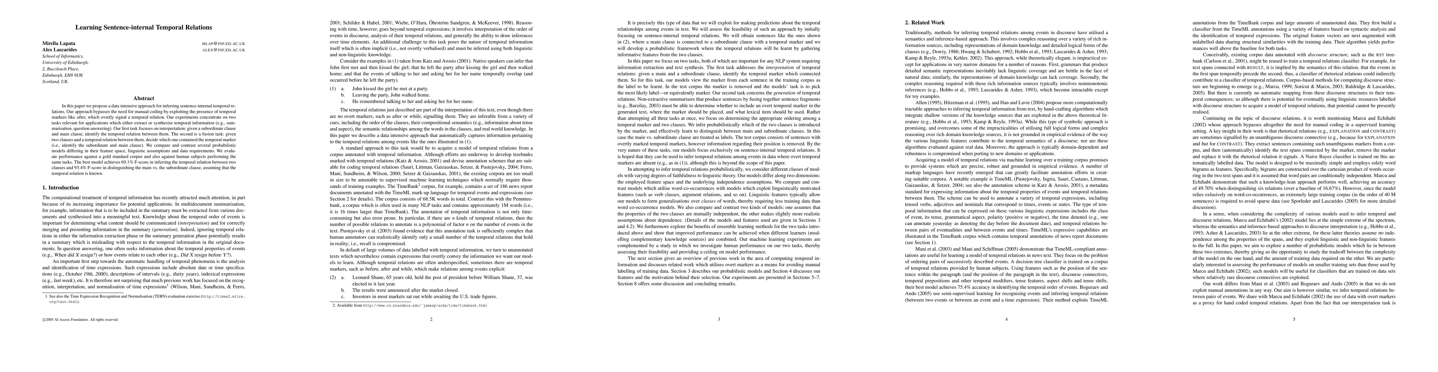 A new approach for inferring sentence-internal temporal relations uses data-intensive methods to bypass manual coding, achieving good performance on pseudo-disambiguation tasks and predicting intra-sentential relations with probabilistic models.
