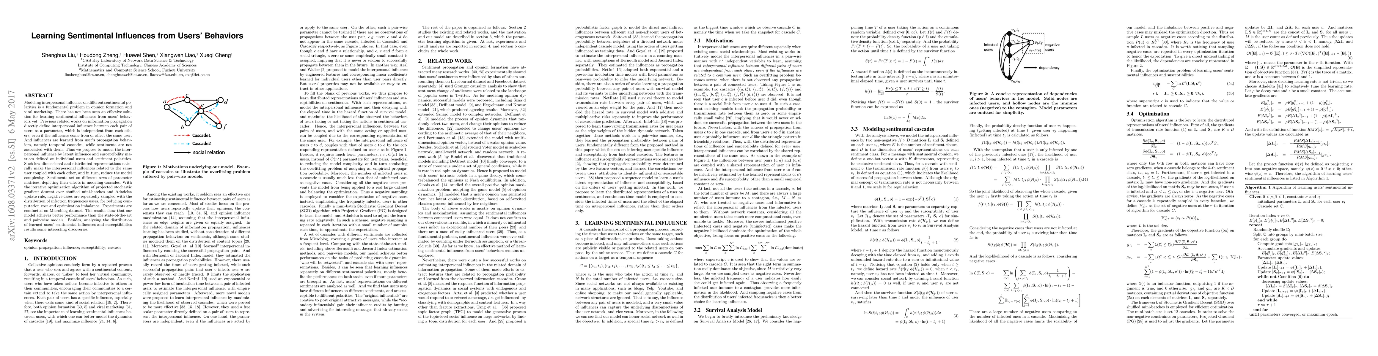 Modeling interpersonal influence on different sentimental polarities is a fundamental problem in opinion formation and viral marketing. There has not been seen an effective solution for learning sentimental influences from users' behaviors yet. Previous related works on information propagation directly define interpersonal influence between each pair of users as a parameter, which is independent from each others, even if the influences come from or affect the same user. And influences are learned from user's propagation behaviors, namely temporal cascades, while sentiments are not associated with them. Thus we propose to model the interpersonal influence by latent influence and susceptibility matrices defined on individual users and sentiment polarities. Such low-dimensional and distributed representations naturally make the interpersonal influences related to the same user coupled with each other, and in turn, reduce the model complexity. Sentiments act on different rows of parameter matrices, depicting their effects in modeling cascades. With the iterative optimization algorithm of projected stochastic gradient descent over shuffled mini-batches and Adadelta update rule, negative cases are repeatedly sampled with the distribution of infection frequencies users, for reducing computation cost and optimization imbalance. Experiments are conducted on Microblog dataset. The results show that our model achieves better performance than the state-of-the-art and pair-wise models. Besides, analyzing the distribution of learned users' sentimental influences and susceptibilities results some interesting discoveries.