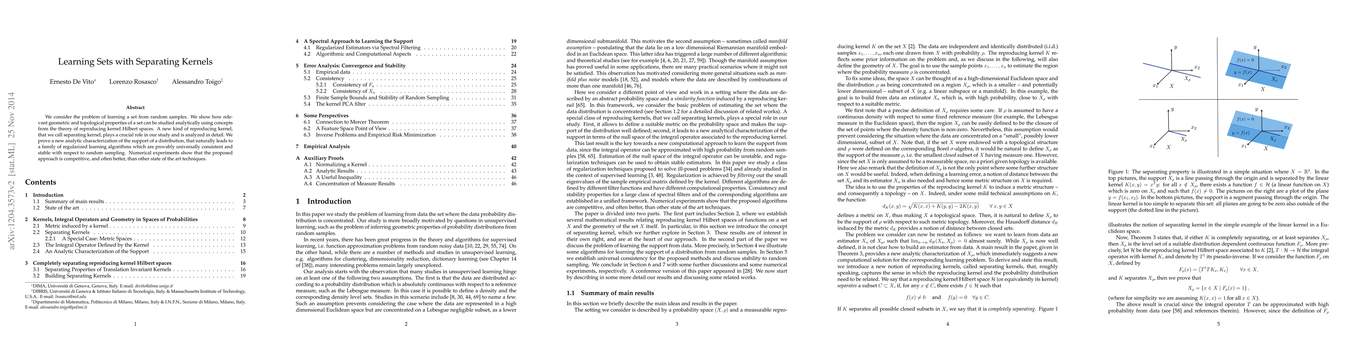 This research introduces separating kernels for learning set properties from samples, offering a new analytic characterization of distribution support. It presents provably consistent learning algorithms and demonstrates competitiveness through numerical experiments.