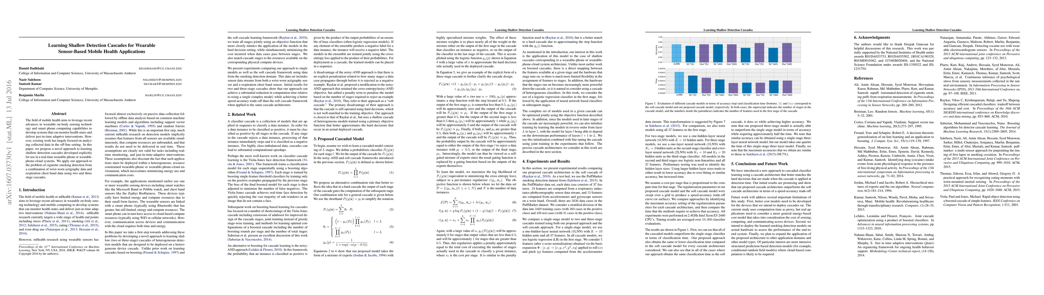The field of mobile health aims to leverage recent advances in wearable on-body sensing technology and smart phone computing capabilities to develop systems that can monitor health states and deliver just-in-time adaptive interventions. However, existing work has largely focused on analyzing collected data in the off-line setting. In this paper, we propose a novel approach to learning shallow detection cascades developed explicitly for use in a real-time wearable-phone or wearable-phone-cloud systems. We apply our approach to the problem of cigarette smoking detection from a combination of wrist-worn actigraphy data and respiration chest band data using two and three stage cascades.