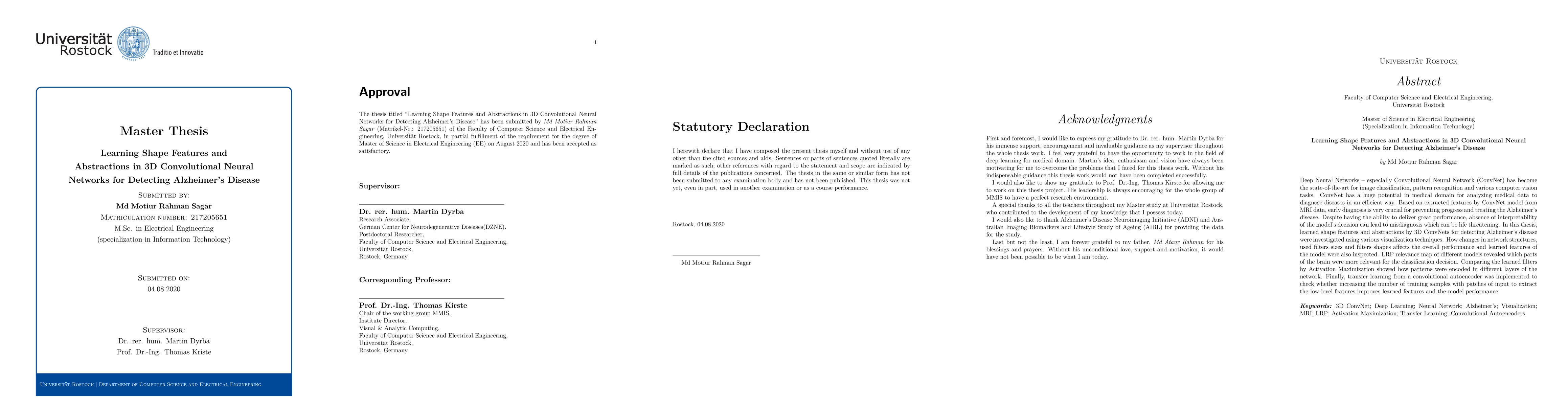 This paper explores the use of 3D Convolutional Neural Networks (ConvNets) to extract shape features and abstractions from MRI data for detecting Alzheimer's disease, investigating the impact of network structure and filter sizes on performance and interpretability. It also examines the effectiveness of transfer learning to enhance model performance.