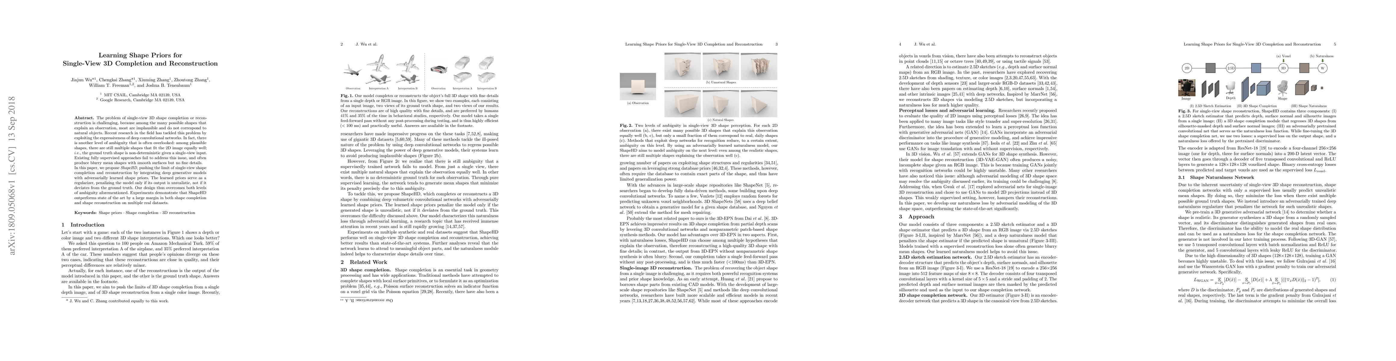 This paper introduces ShapeHD, a method that combines deep generative models with adversarially learned shape priors to tackle the ambiguity in single-view 3D shape completion and reconstruction. The proposed approach outperforms existing methods by generating more realistic and detailed 3D shapes, addressing both the ambiguity of plausible shapes and the non-deterministic nature of ground truth shapes.
