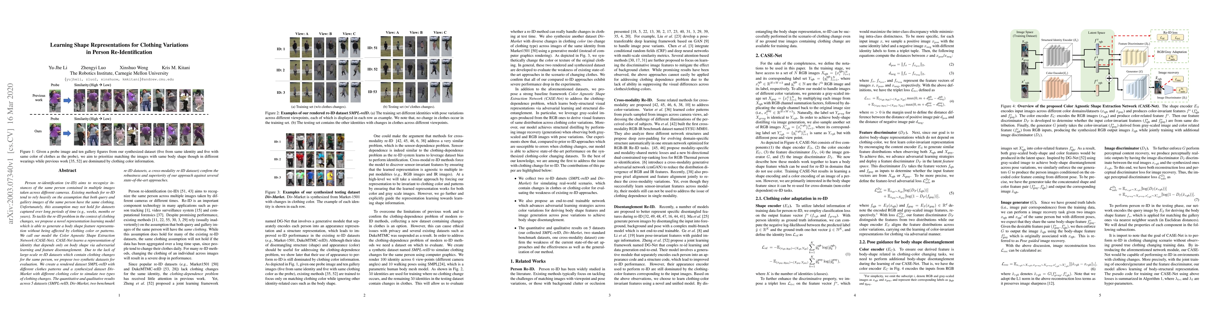 The paper proposes a novel representation learning model called CASE-Net to address person re-identification challenges when individuals change clothing over time. The model generates body shape features that are color and pattern agnostic, validated through synthetic datasets and multiple real-world datasets, demonstrating superior performance compared to state-of-the-art methods.