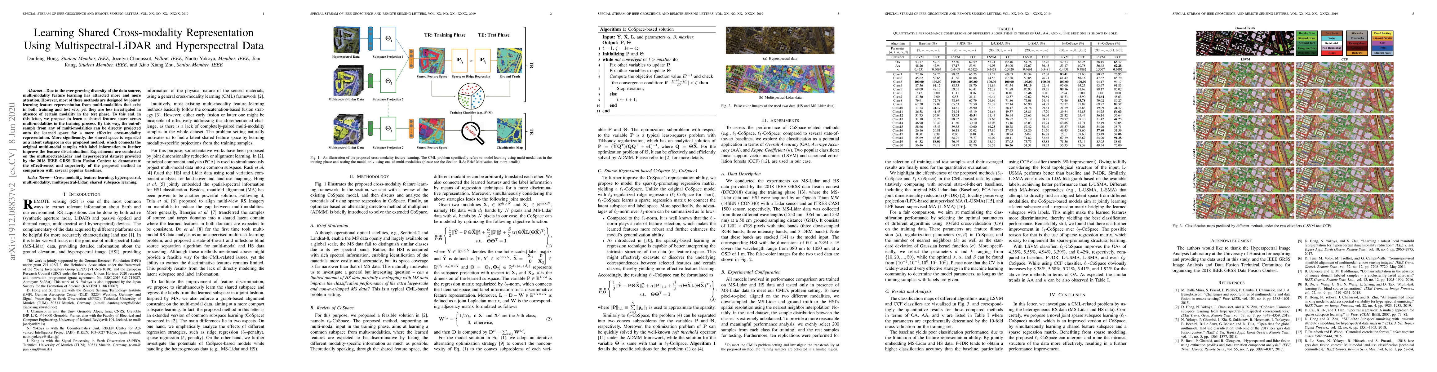 This paper proposes a method to learn shared cross-modality representation using multispectral-LiDAR and hyperspectral data, focusing on creating a latent subspace that can project out-of-sample data from any modality effectively. Experiments on a dataset from the 2018 IEEE GRSS Data Fusion Contest show the method's effectiveness compared to popular baselines.