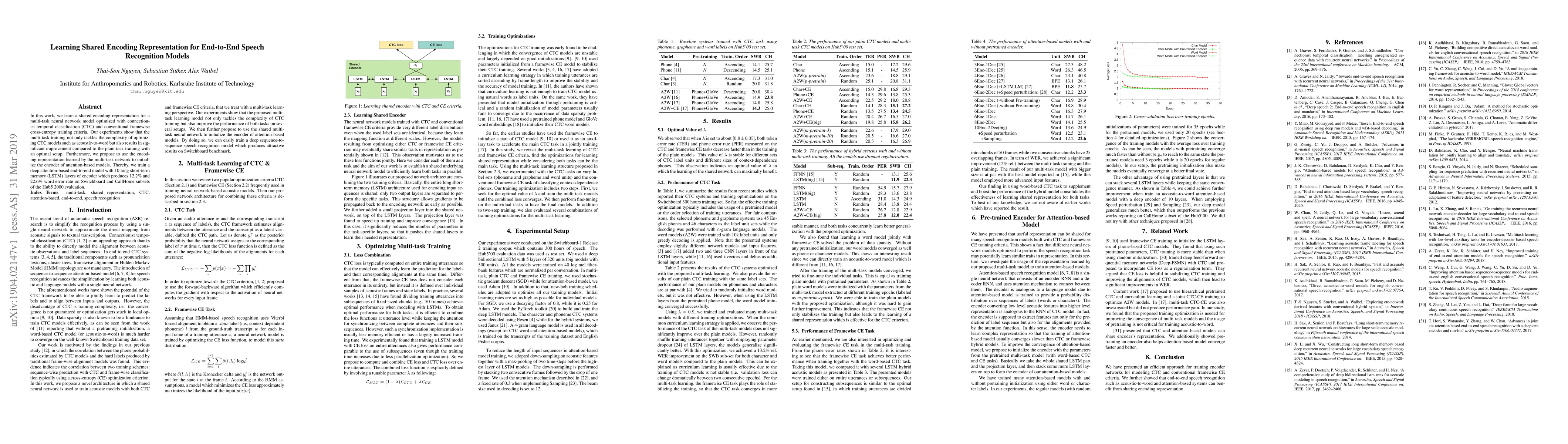 In this work, we learn a shared encoding representation for a multi-task neural network model optimized with connectionist temporal classification (CTC) and conventional framewise cross-entropy training criteria. Our experiments show that the multi-task training not only tackles the complexity of optimizing CTC models such as acoustic-to-word but also results in significant improvement compared to the plain-task training with an optimal setup. Furthermore, we propose to use the encoding representation learned by the multi-task network to initialize the encoder of attention-based models. Thereby, we train a deep attention-based end-to-end model with 10 long short-term memory (LSTM) layers of encoder which produces 12.2\% and 22.6\% word-error-rate on Switchboard and CallHome subsets of the Hub5 2000 evaluation.