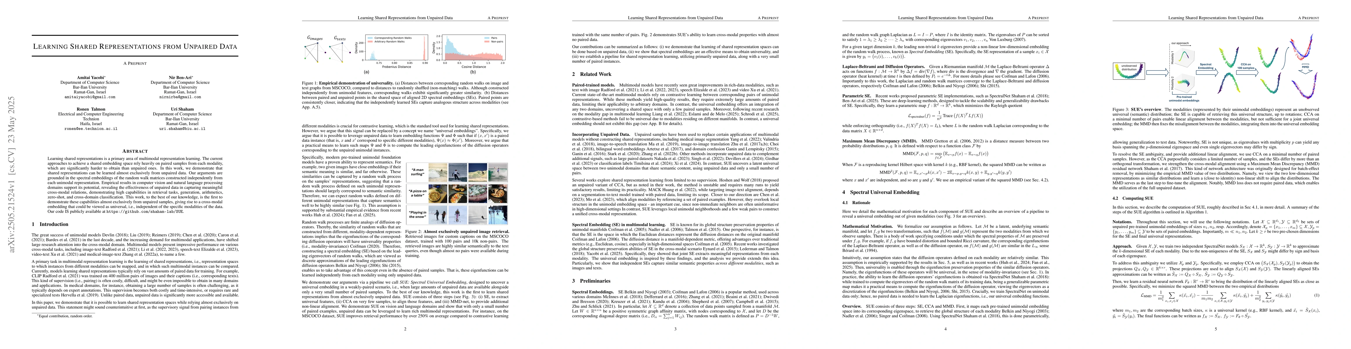 Learning shared representations is a primary area of multimodal representation learning. The current approaches to achieve a shared embedding space rely heavily on paired samples from each modality, which are significantly harder to obtain than unpaired ones. In this work, we demonstrate that shared representations can be learned almost exclusively from unpaired data. Our arguments are grounded in the spectral embeddings of the random walk matrices constructed independently from each unimodal representation. Empirical results in computer vision and natural language processing domains support its potential, revealing the effectiveness of unpaired data in capturing meaningful cross-modal relations, demonstrating high capabilities in retrieval tasks, generation, arithmetics, zero-shot, and cross-domain classification. This work, to the best of our knowledge, is the first to demonstrate these capabilities almost exclusively from unpaired samples, giving rise to a cross-modal embedding that could be viewed as universal, i.e., independent of the specific modalities of the data. Our code IS publicly available at https://github.com/shaham-lab/SUE.