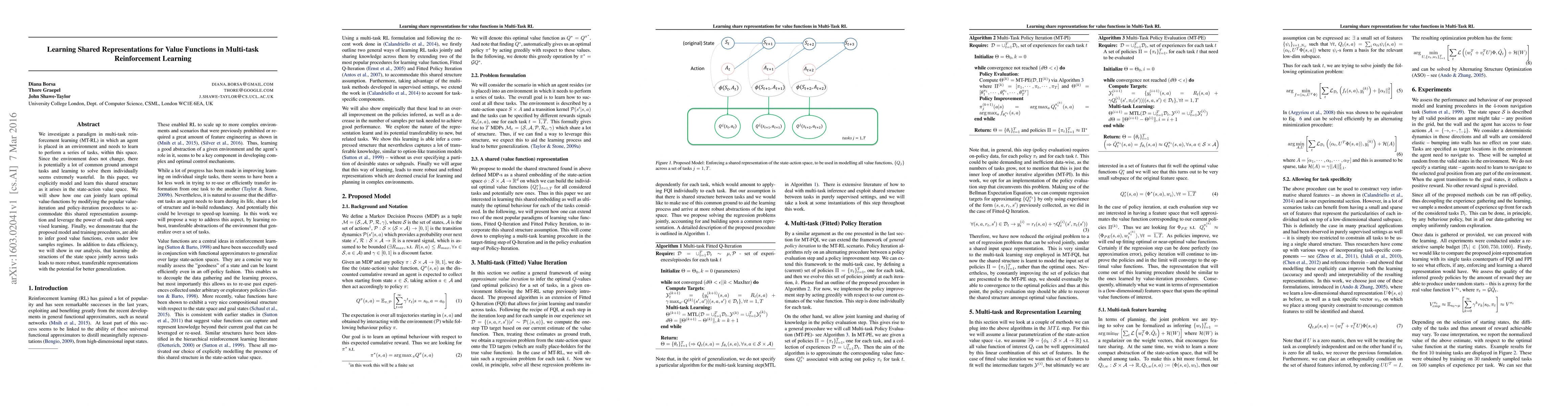 We investigate a paradigm in multi-task reinforcement learning (MT-RL) in which an agent is placed in an environment and needs to learn to perform a series of tasks, within this space. Since the environment does not change, there is potentially a lot of common ground amongst tasks and learning to solve them individually seems extremely wasteful. In this paper, we explicitly model and learn this shared structure as it arises in the state-action value space. We will show how one can jointly learn optimal value-functions by modifying the popular Value-Iteration and Policy-Iteration procedures to accommodate this shared representation assumption and leverage the power of multi-task supervised learning. Finally, we demonstrate that the proposed model and training procedures, are able to infer good value functions, even under low samples regimes. In addition to data efficiency, we will show in our analysis, that learning abstractions of the state space jointly across tasks leads to more robust, transferable representations with the potential for better generalization. this shared representation assumption and leverage the power of multi-task supervised learning. Finally, we demonstrate that the proposed model and training procedures, are able to infer good value functions, even under low samples regimes. In addition to data efficiency, we will show in our analysis, that learning abstractions of the state space jointly across tasks leads to more robust, transferable representations with the potential for better generalization.