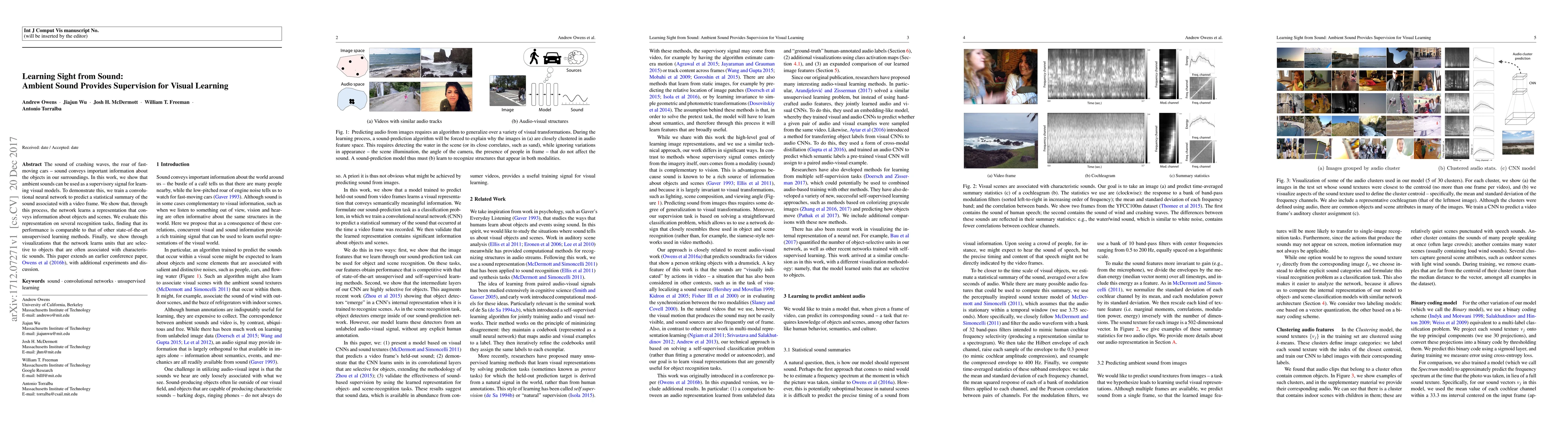 The sound of crashing waves, the roar of fast-moving cars -- sound conveys important information about the objects in our surroundings. In this work, we show that ambient sounds can be used as a supervisory signal for learning visual models. To demonstrate this, we train a convolutional neural network to predict a statistical summary of the sound associated with a video frame. We show that, through this process, the network learns a representation that conveys information about objects and scenes. We evaluate this representation on several recognition tasks, finding that its performance is comparable to that of other state-of-the-art unsupervised learning methods. Finally, we show through visualizations that the network learns units that are selective to objects that are often associated with characteristic sounds. This paper extends an earlier conference paper, Owens et al. 2016, with additional experiments and discussion.