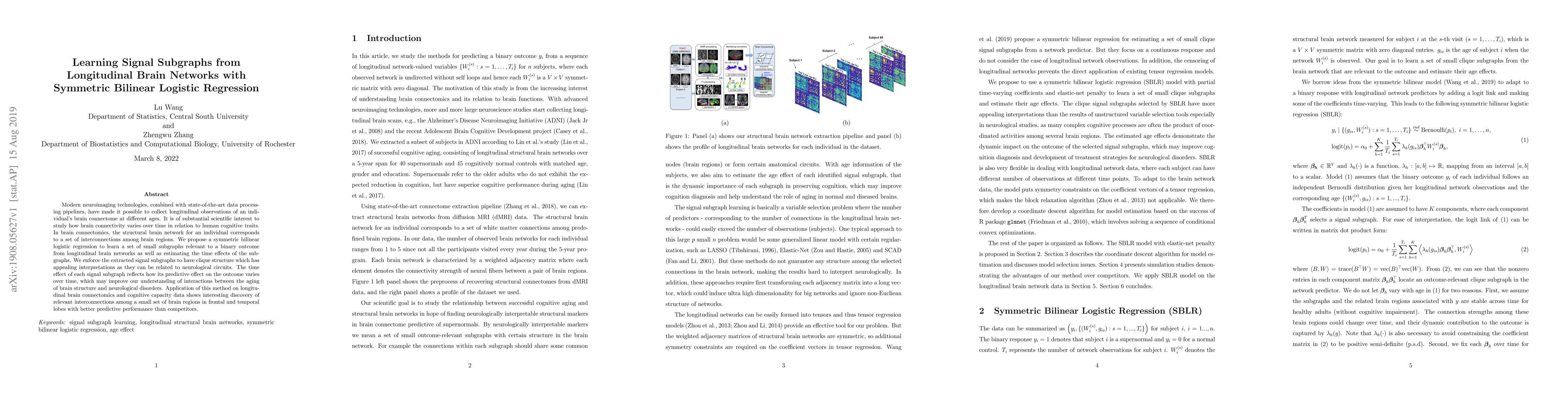 Modern neuroimaging technologies, combined with state-of-the-art data processing pipelines, have made it possible to collect longitudinal observations of an individual's brain connectome at different ages. It is of substantial scientific interest to study how brain connectivity varies over time in relation to human cognitive traits. In brain connectomics, the structural brain network for an individual corresponds to a set of interconnections among brain regions. We propose a symmetric bilinear logistic regression to learn a set of small subgraphs relevant to a binary outcome from longitudinal brain networks as well as estimating the time effects of the subgraphs. We enforce the extracted signal subgraphs to have clique structure which has appealing interpretations as they can be related to neurological circuits. The time effect of each signal subgraph reflects how its predictive effect on the outcome varies over time, which may improve our understanding of interactions between the aging of brain structure and neurological disorders. Application of this method on longitudinal brain connectomics and cognitive capacity data shows interesting discovery of relevant interconnections among a small set of brain regions in frontal and temporal lobes with better predictive performance than competitors.