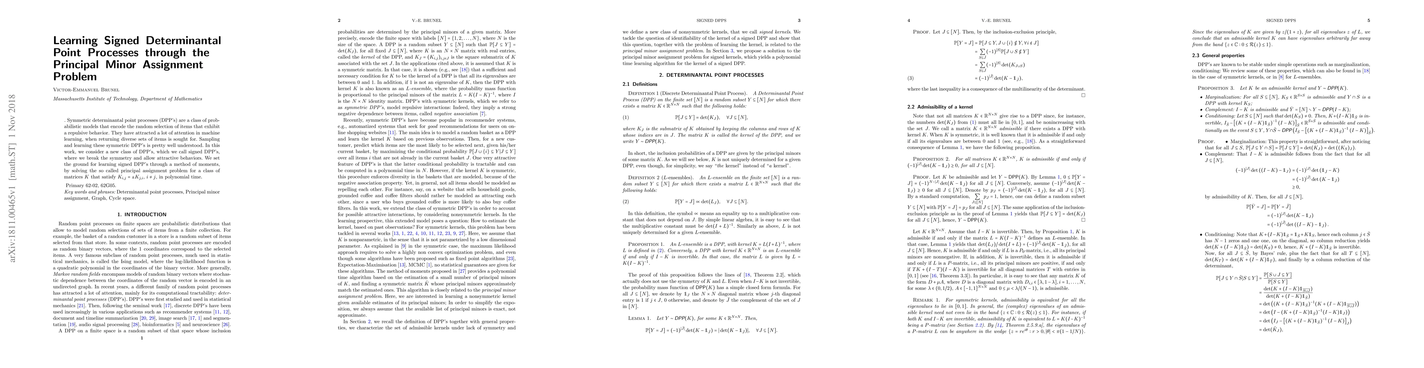 Symmetric determinantal point processes (DPP's) are a class of probabilistic models that encode the random selection of items that exhibit a repulsive behavior. They have attracted a lot of attention in machine learning, when returning diverse sets of items is sought for. Sampling and learning these symmetric DPP's is pretty well understood. In this work, we consider a new class of DPP's, which we call signed DPP's, where we break the symmetry and allow attractive behaviors. We set the ground for learning signed DPP's through a method of moments, by solving the so called principal assignment problem for a class of matrices $K$ that satisfy $K_{i,j}=\pm K_{j,i}$, $i\neq j$, in polynomial time.