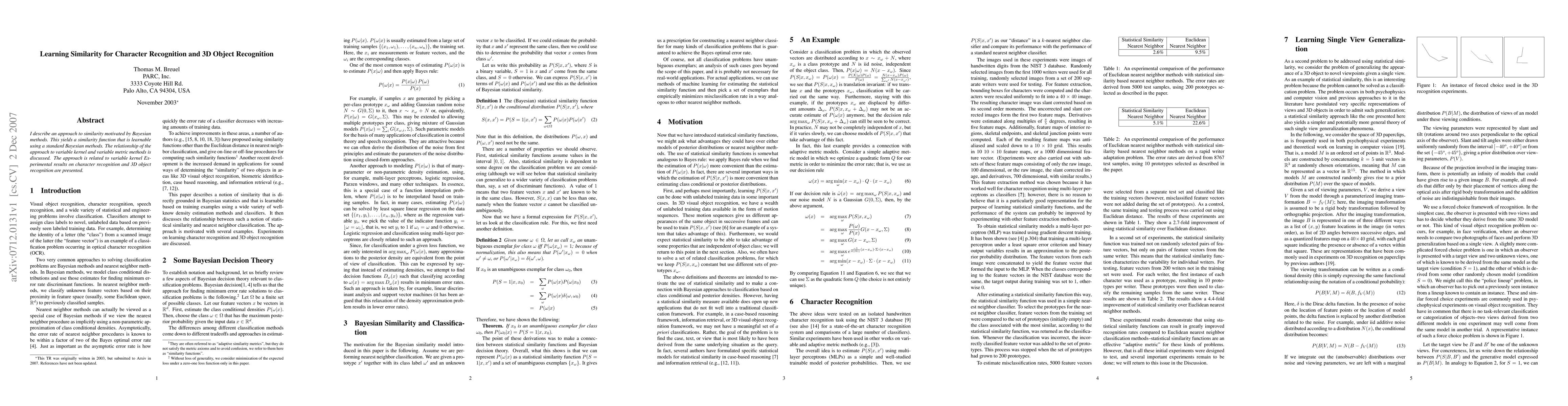 This paper proposes a Bayesian-motivated learnable similarity function for character and 3D object recognition, comparing it to variable kernel and metric methods, and demonstrates its effectiveness through experimental results.