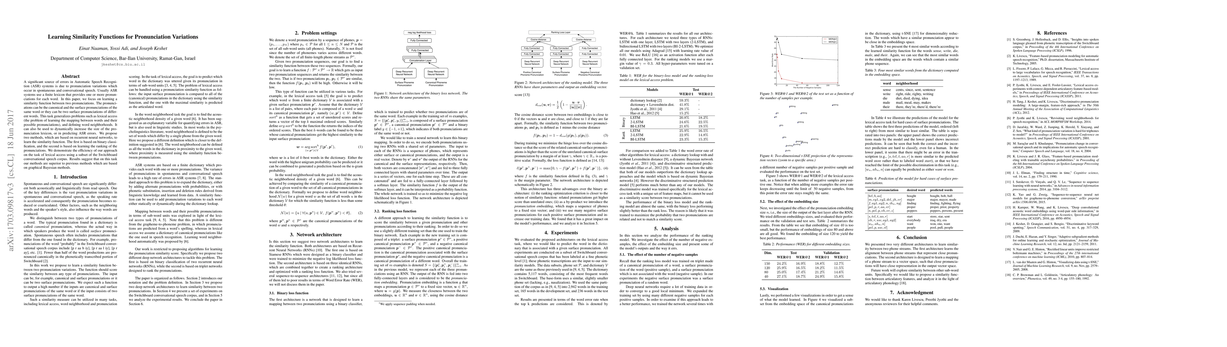 A significant source of errors in Automatic Speech Recognition (ASR) systems is due to pronunciation variations which occur in spontaneous and conversational speech. Usually ASR systems use a finite lexicon that provides one or more pronunciations for each word. In this paper, we focus on learning a similarity function between two pronunciations. The pronunciations can be the canonical and the surface pronunciations of the same word or they can be two surface pronunciations of different words. This task generalizes problems such as lexical access (the problem of learning the mapping between words and their possible pronunciations), and defining word neighborhoods. It can also be used to dynamically increase the size of the pronunciation lexicon, or in predicting ASR errors. We propose two methods, which are based on recurrent neural networks, to learn the similarity function. The first is based on binary classification, and the second is based on learning the ranking of the pronunciations. We demonstrate the efficiency of our approach on the task of lexical access using a subset of the Switchboard conversational speech corpus. Results suggest that on this task our methods are superior to previous methods which are based on graphical Bayesian methods.