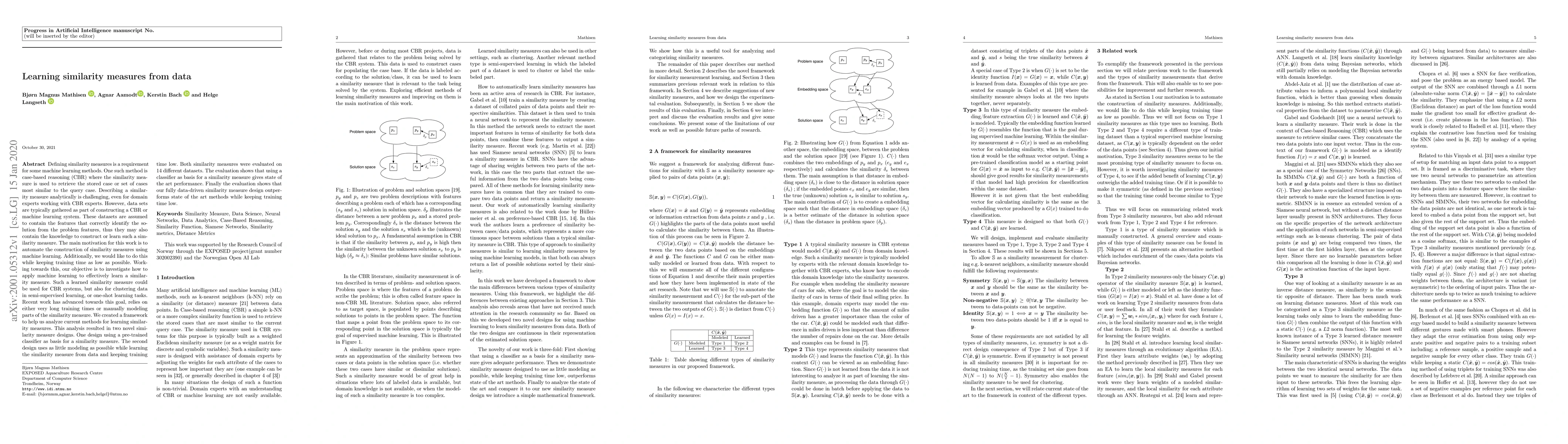 Defining similarity measures is a requirement for some machine learning methods. One such method is case-based reasoning (CBR) where the similarity measure is used to retrieve the stored case or set of cases most similar to the query case. Describing a similarity measure analytically is challenging, even for domain experts working with CBR experts. However, data sets are typically gathered as part of constructing a CBR or machine learning system. These datasets are assumed to contain the features that correctly identify the solution from the problem features, thus they may also contain the knowledge to construct or learn such a similarity measure. The main motivation for this work is to automate the construction of similarity measures using machine learning, while keeping training time as low as possible. Our objective is to investigate how to apply machine learning to effectively learn a similarity measure. Such a learned similarity measure could be used for CBR systems, but also for clustering data in semi-supervised learning, or one-shot learning tasks. Recent work has advanced towards this goal, relies on either very long training times or manually modeling parts of the similarity measure. We created a framework to help us analyze current methods for learning similarity measures. This analysis resulted in two novel similarity measure designs. One design using a pre-trained classifier as basis for a similarity measure. The second design uses as little modeling as possible while learning the similarity measure from data and keeping training time low. Both similarity measures were evaluated on 14 different datasets. The evaluation shows that using a classifier as basis for a similarity measure gives state of the art performance. Finally the evaluation shows that our fully data-driven similarity measure design outperforms state of the art methods while keeping training time low.