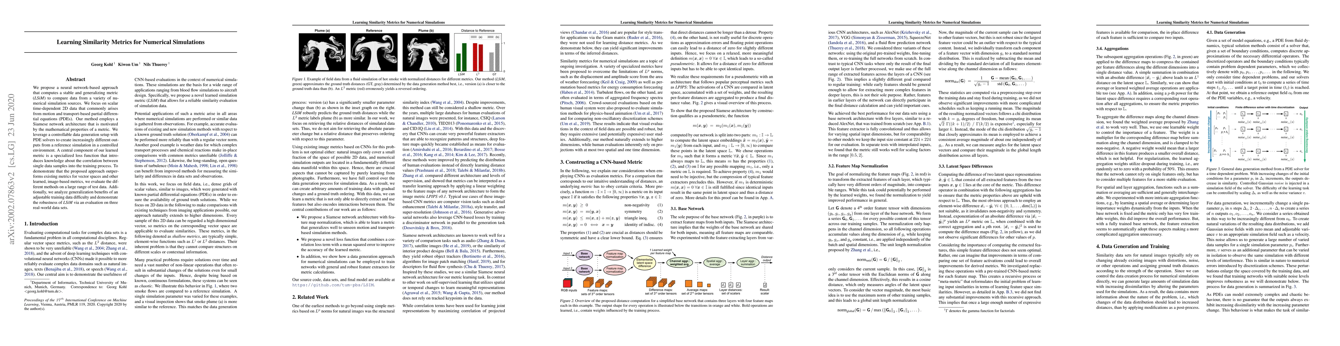 We propose a neural network-based approach that computes a stable and generalizing metric (LSiM) to compare data from a variety of numerical simulation sources. We focus on scalar time-dependent 2D data that commonly arises from motion and transport-based partial differential equations (PDEs). Our method employs a Siamese network architecture that is motivated by the mathematical properties of a metric. We leverage a controllable data generation setup with PDE solvers to create increasingly different outputs from a reference simulation in a controlled environment. A central component of our learned metric is a specialized loss function that introduces knowledge about the correlation between single data samples into the training process. To demonstrate that the proposed approach outperforms existing metrics for vector spaces and other learned, image-based metrics, we evaluate the different methods on a large range of test data. Additionally, we analyze generalization benefits of an adjustable training data difficulty and demonstrate the robustness of LSiM via an evaluation on three real-world data sets.