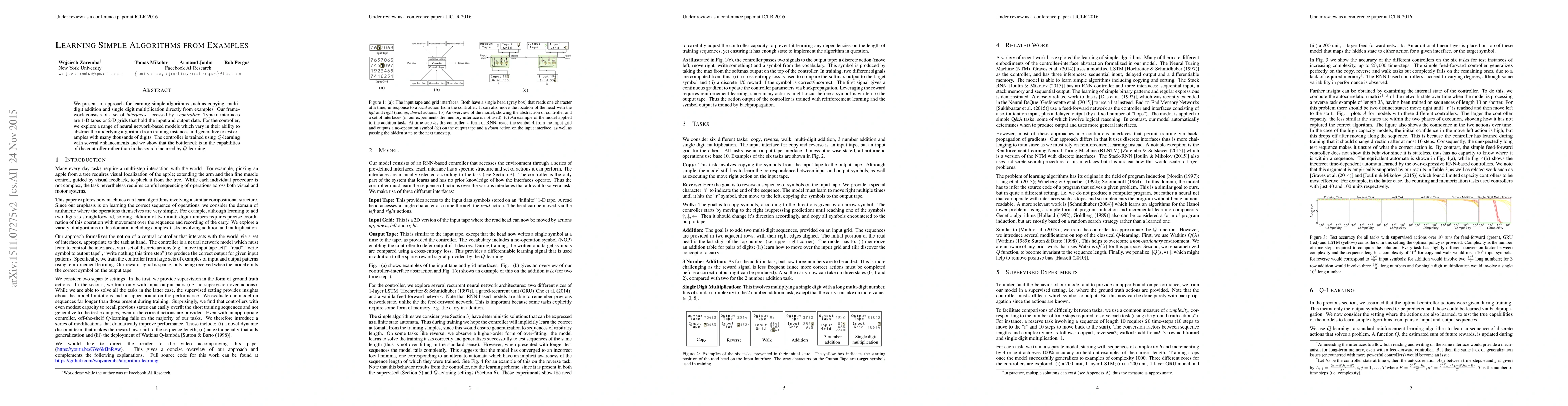 We present an approach for learning simple algorithms such as copying, multi-digit addition and single digit multiplication directly from examples. Our framework consists of a set of interfaces, accessed by a controller. Typical interfaces are 1-D tapes or 2-D grids that hold the input and output data. For the controller, we explore a range of neural network-based models which vary in their ability to abstract the underlying algorithm from training instances and generalize to test examples with many thousands of digits. The controller is trained using $Q$-learning with several enhancements and we show that the bottleneck is in the capabilities of the controller rather than in the search incurred by $Q$-learning.