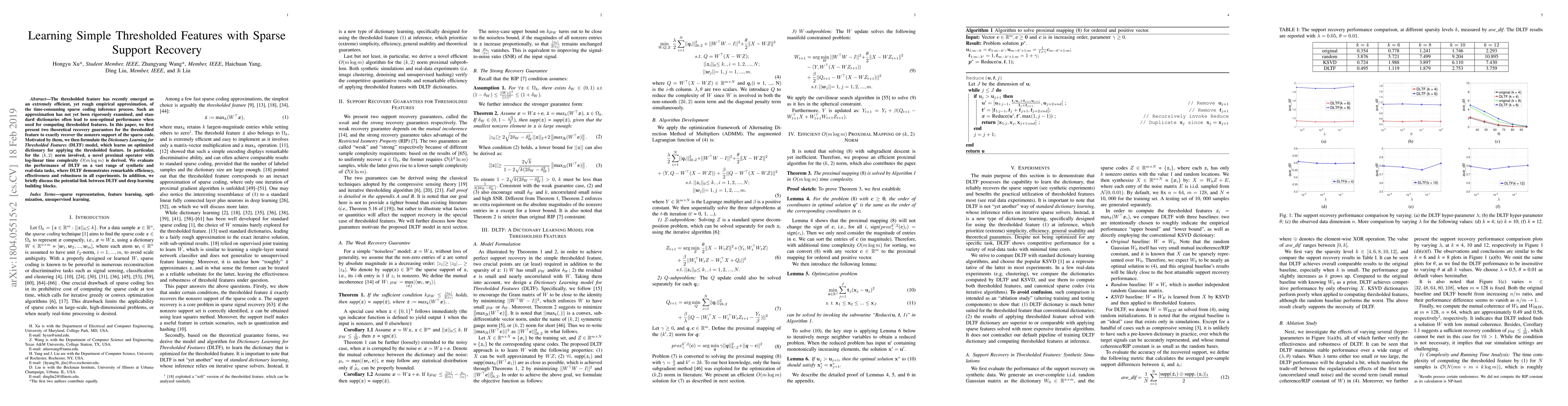 This paper presents theoretical recovery guarantees for thresholded features to accurately recover sparse code support and introduces the Dictionary Learning for Thresholded Features (DLTF) model to optimize dictionary learning. The DLTF model employs a novel proximal operator with efficient log-linear time complexity and demonstrates superior performance in various synthetic and real-data tasks.