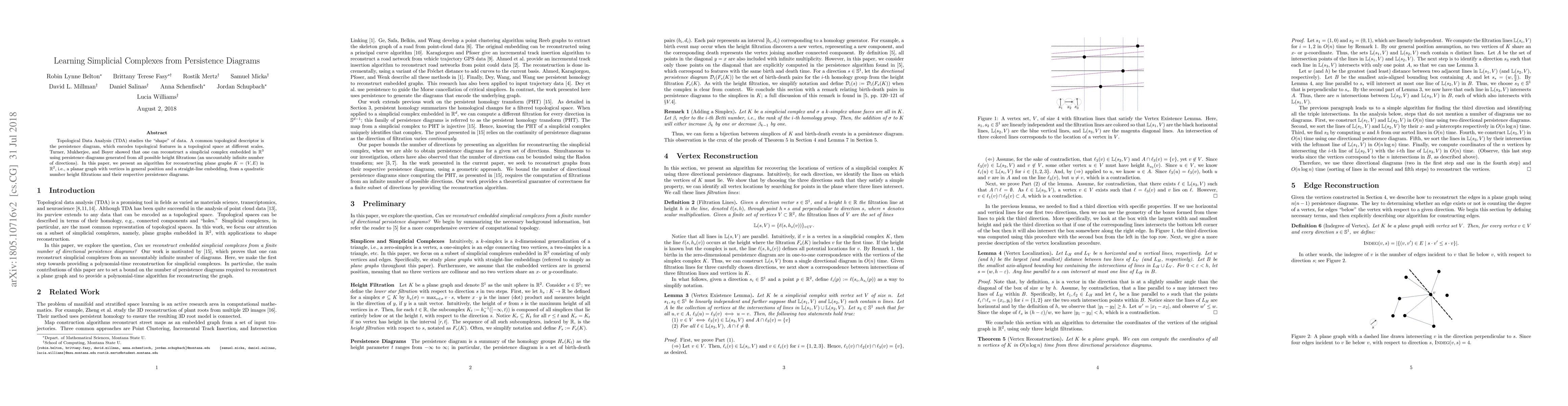 This paper proposes an algorithm to reconstruct plane graphs from persistence diagrams derived from a quadratic number of height filtrations, enabling the recovery of a simplicial complex embedded in 2D space from topological features encoded in these diagrams.