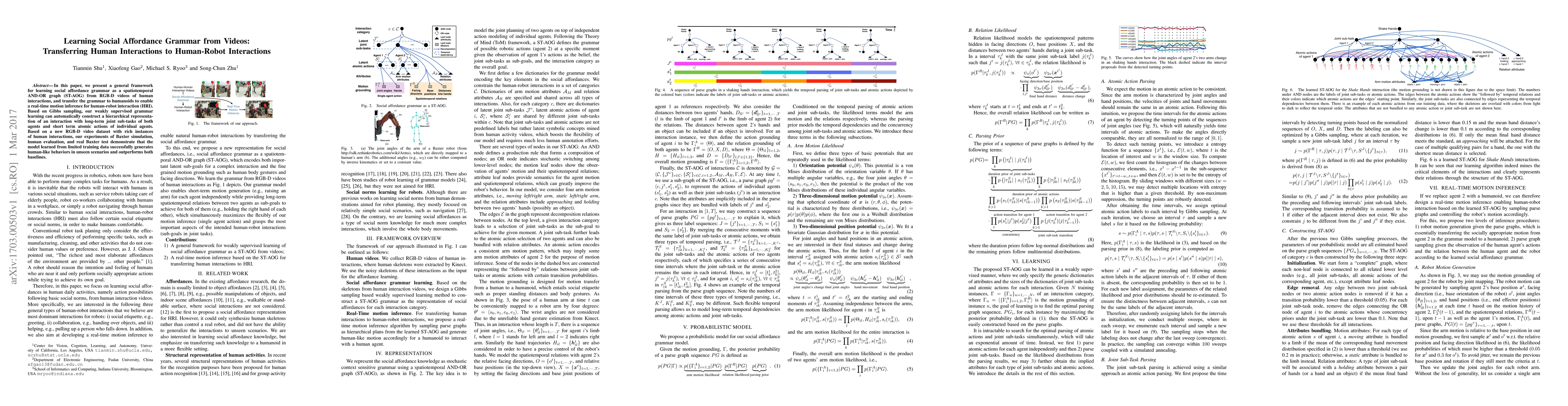 This paper introduces a framework for learning social affordance grammar from human interactions in videos, transferring it to humanoid robots for real-time motion inference in human-robot interactions. The method uses Gibbs sampling to construct a hierarchical representation and demonstrates successful application with a new RGB-D video dataset, outperforming baselines in generating human-like behaviors.