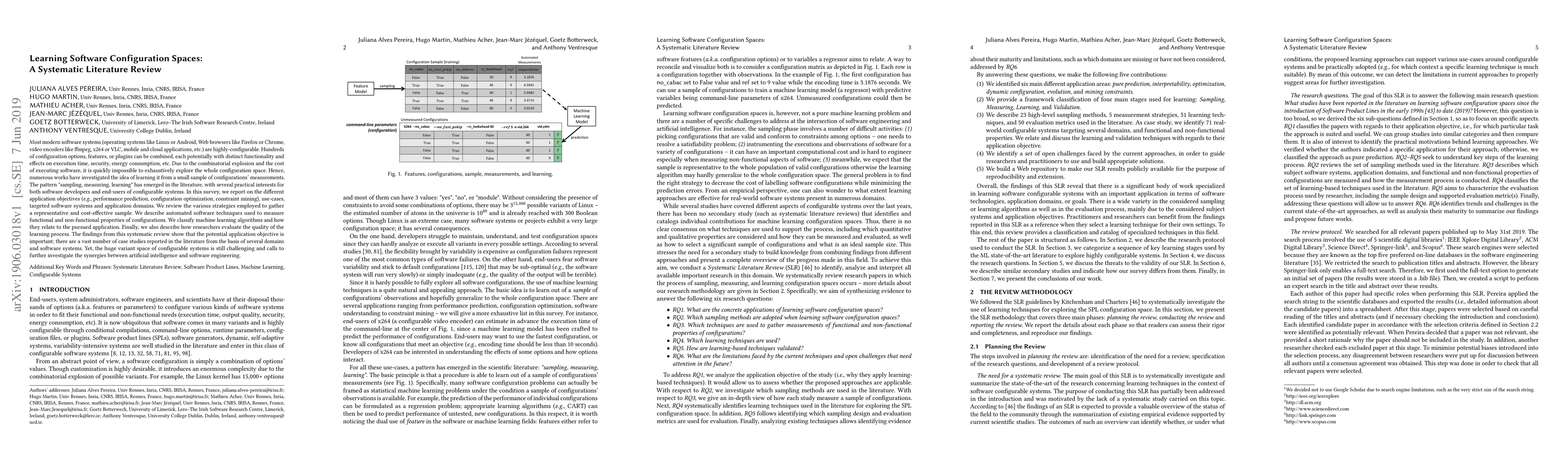 Most modern software systems (operating systems like Linux or Android, Web browsers like Firefox or Chrome, video encoders like ffmpeg, x264 or VLC, mobile and cloud applications, etc.) are highly-configurable. Hundreds of configuration options, features, or plugins can be combined, each potentially with distinct functionality and effects on execution time, security, energy consumption, etc. Due to the combinatorial explosion and the cost of executing software, it is quickly impossible to exhaustively explore the whole configuration space. Hence, numerous works have investigated the idea of learning it from a small sample of configurations' measurements. The pattern "sampling, measuring, learning" has emerged in the literature, with several practical interests for both software developers and end-users of configurable systems. In this survey, we report on the different application objectives (e.g., performance prediction, configuration optimization, constraint mining), use-cases, targeted software systems and application domains. We review the various strategies employed to gather a representative and cost-effective sample. We describe automated software techniques used to measure functional and non-functional properties of configurations. We classify machine learning algorithms and how they relate to the pursued application. Finally, we also describe how researchers evaluate the quality of the learning process. The findings from this systematic review show that the potential application objective is important; there are a vast number of case studies reported in the literature from the basis of several domains and software systems. Yet, the huge variant space of configurable systems is still challenging and calls to further investigate the synergies between artificial intelligence and software engineering.