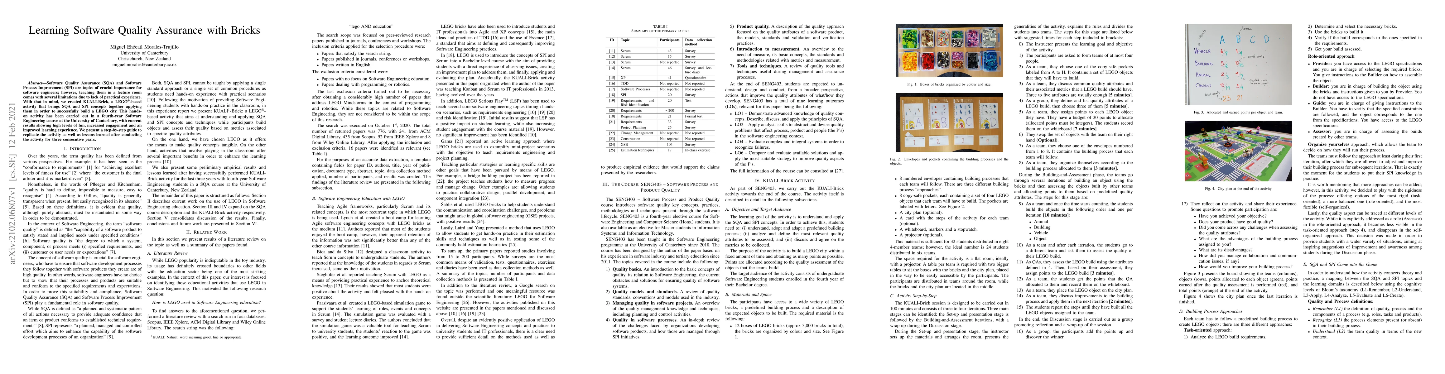 Software Quality Assurance (SQA) and Software Process Improvement (SPI) are topics of crucial importance for software engineers; however, teaching them in a lecture room comes with several limitations due to lack of practical experience. With that in mind, we created KUALI-Brick, a LEGO(R)-based activity that brings SQA and SPI concepts together applying them in order to successfully build a LEGO city. This hands-on activity has been carried out in a fourth-year Software Engineering course at the University of Canterbury, with current results showing high levels of fun, increased engagement and an improved learning experience. We present a step-by-step guide to replicate the activity as well as lessons learned after conducting the activity for three consecutive years.