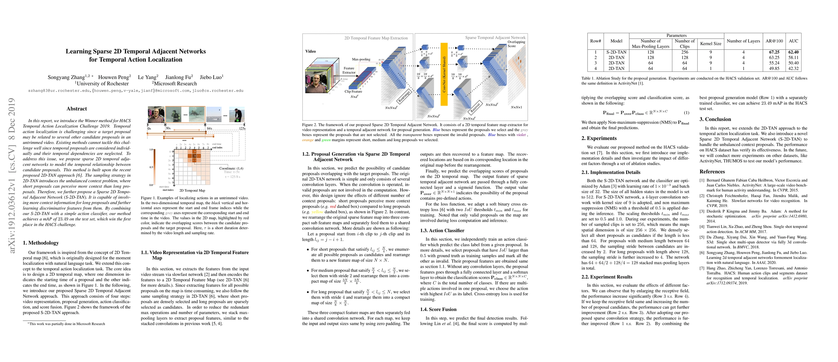In this report, we introduce the Winner method for HACS Temporal Action Localization Challenge 2019. Temporal action localization is challenging since a target proposal may be related to several other candidate proposals in an untrimmed video. Existing methods cannot tackle this challenge well since temporal proposals are considered individually and their temporal dependencies are neglected. To address this issue, we propose sparse 2D temporal adjacent networks to model the temporal relationship between candidate proposals. This method is built upon the recent proposed 2D-TAN approach. The sampling strategy in 2D-TAN introduces the unbalanced context problem, where short proposals can perceive more context than long proposals. Therefore, we further propose a Sparse 2D Temporal Adjacent Network (S-2D-TAN). It is capable of involving more context information for long proposals and further learning discriminative features from them. By combining our S-2D-TAN with a simple action classifier, our method achieves a mAP of 23.49 on the test set, which win the first place in the HACS challenge.