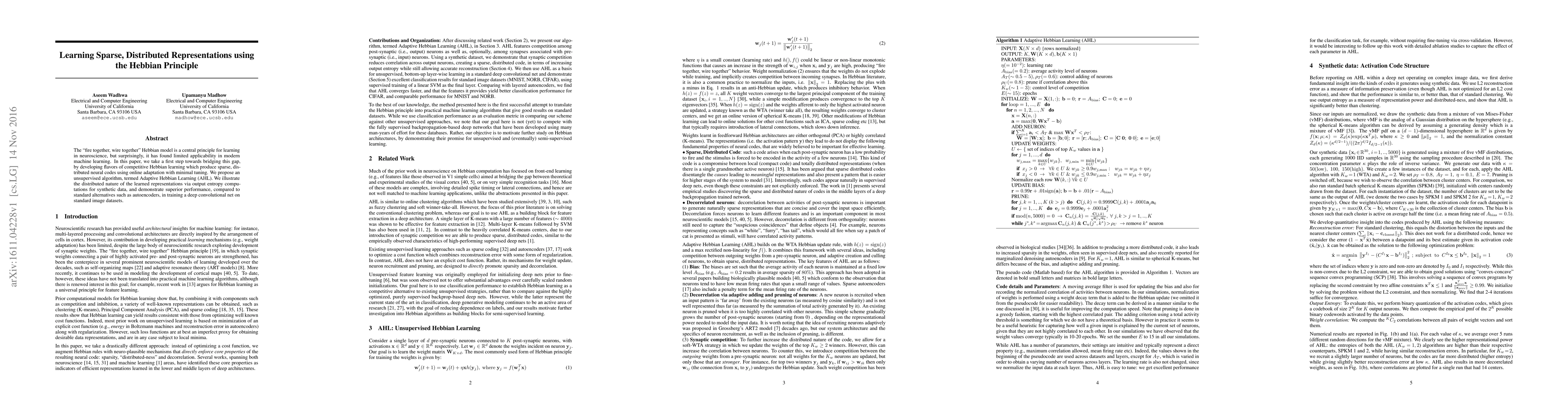 This paper explores the application of the Hebbian learning principle in modern machine learning to create sparse, distributed neural codes. It introduces Adaptive Hebbian Learning (AHL), an unsupervised algorithm that outperforms standard autoencoders in training deep convolutional networks on image datasets.